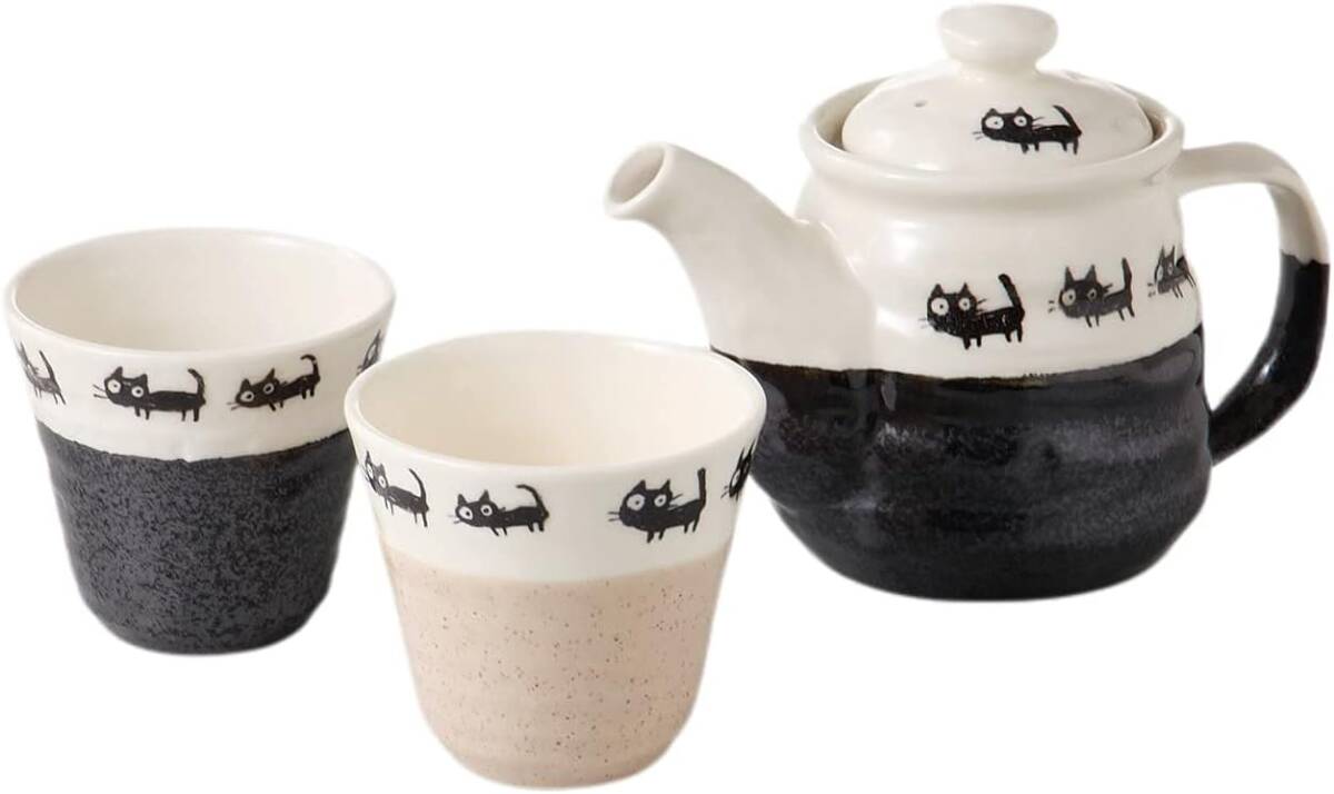 美濃焼! ☆黒ネコ茶器セット☆ V4068-9  新品 湯飲 湯呑 汲出 急須 やかん 鉄瓶 ポット ギフト