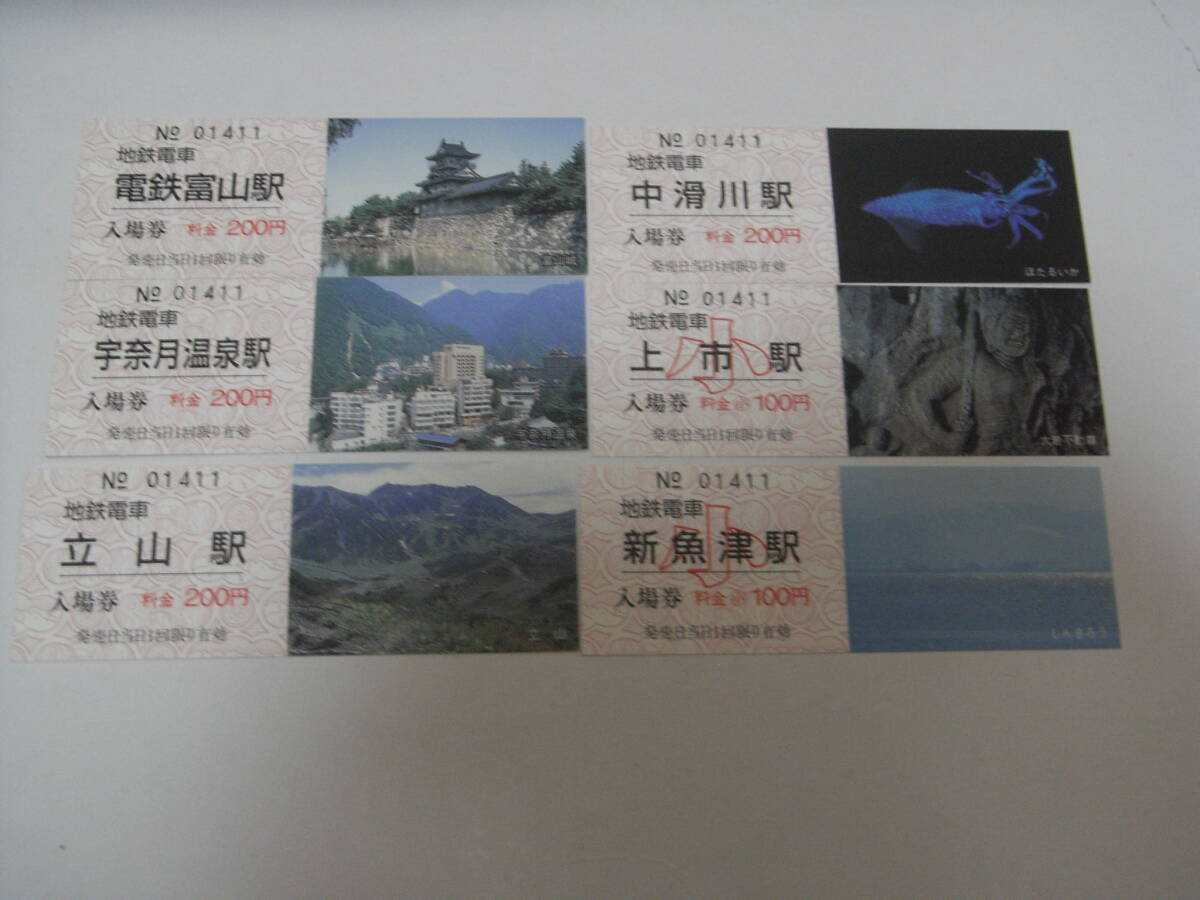 袋と電鉄富山駅・中滑川駅・宇奈月温泉駅・立山駅・新魚津駅・上市駅の入場券です。