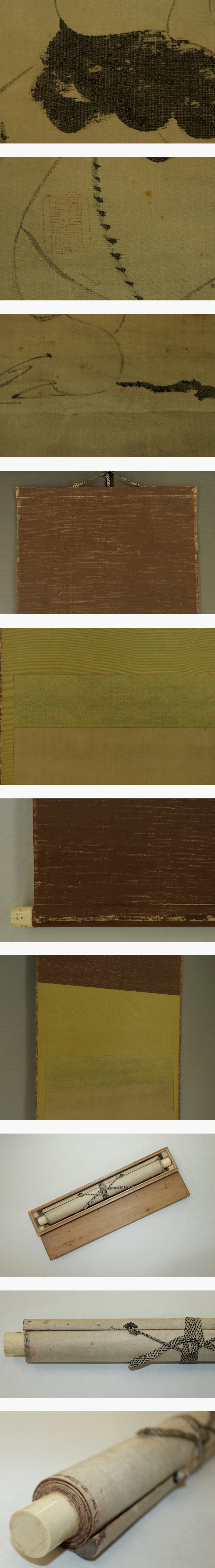松村景文 まつむら-けいぶん(1779-1843) 江戸後期の四条派の画家。京都生。呉春の末弟。 通称は要人、幼名は直治、字は子藻、号は華渓。 兄より絵の指導を受け、また円山応挙の写生風を学び一家を成す。 天保14年(1843)歿、65才。 本紙は、染み、汚れ、軽い皺、ヤケがあります。 表装は、染み、汚れ、折れ、皺、虫食い、破れ、ほつれ、生地剥れ、擦れ、 軸先に汚れとヒビがあります。 【サイズ】 作品 横約33cm×縦約53.5cm 表装 横約37.5cm×縦約143.5cm |