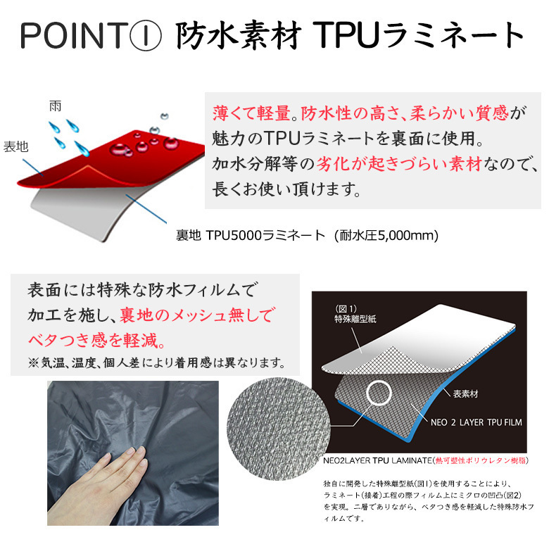 ・特殊防水フィルムを使用する事で、ベタ感を軽減。