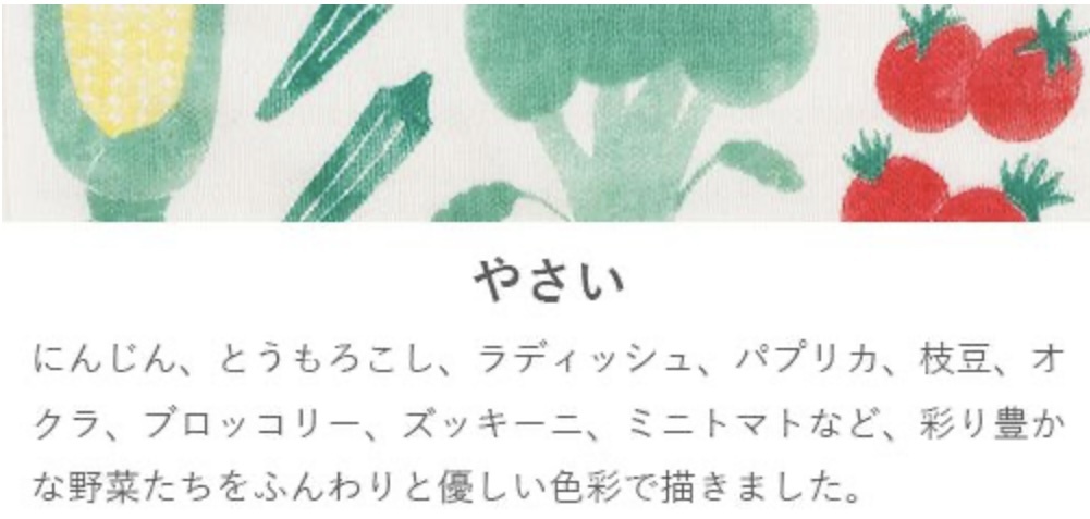 身近にあるやさいが、手描きの線や自然な塗りムラによって愛らしく、色とりどりに表現されています。