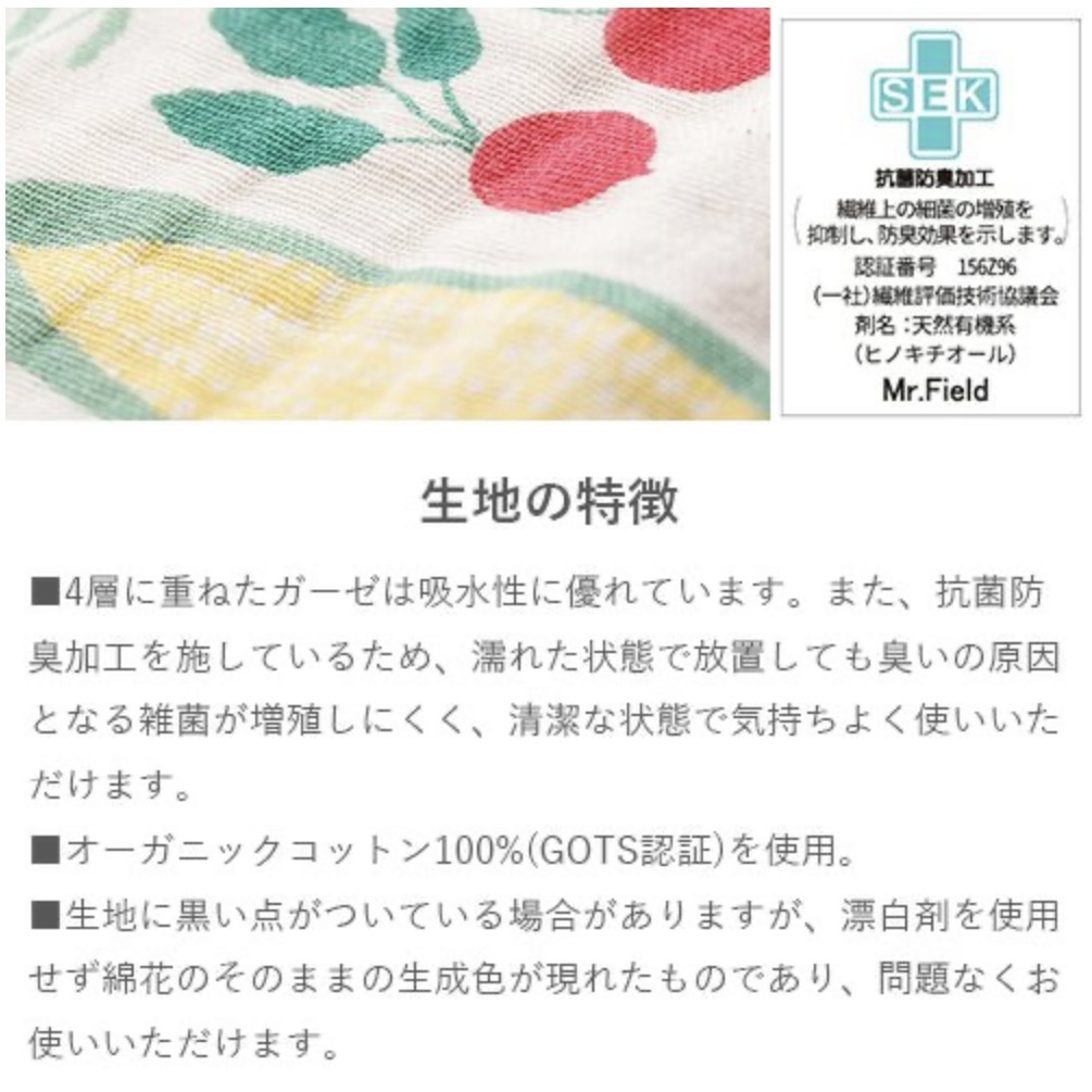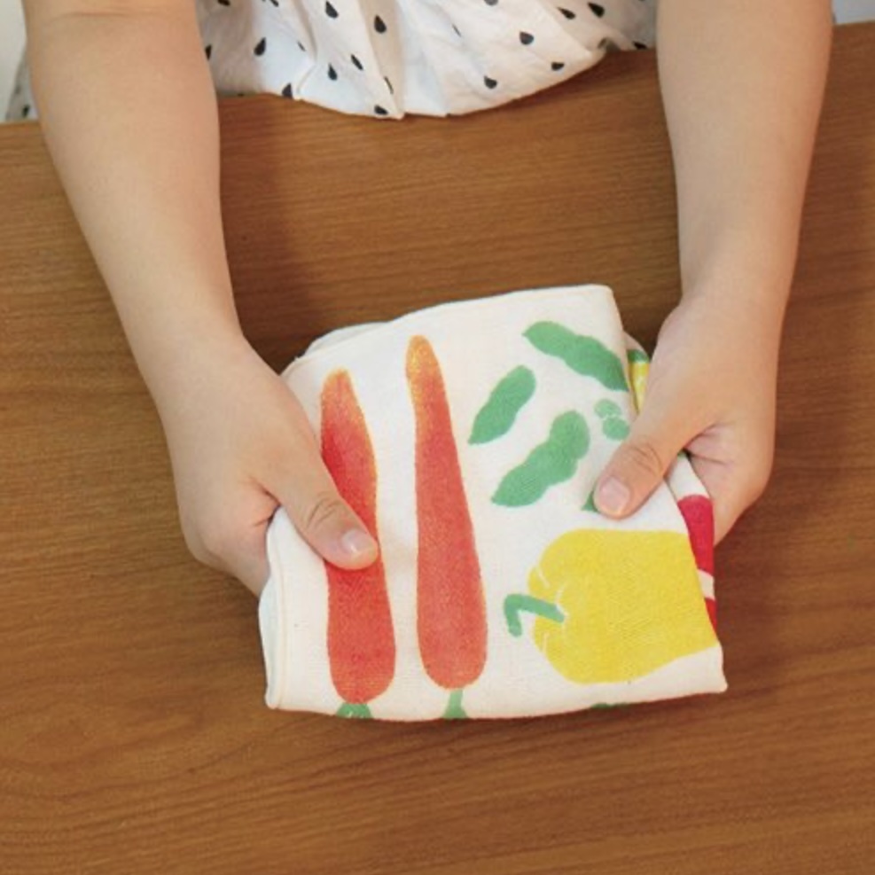 4層に重ねたガーゼは薄手ながら吸水性が高く、手洗いうがいの後に使用したり、汗をぬぐうのにも頼れる一枚です。