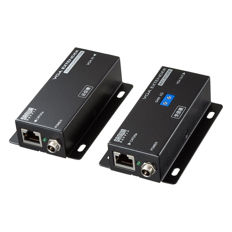 LANケーブル1本でアナログVGA映像を720p解像度で最大180m、1080p解像度なら最大60mまで延長できるディスプレイエクステンダーのセットモデル。
