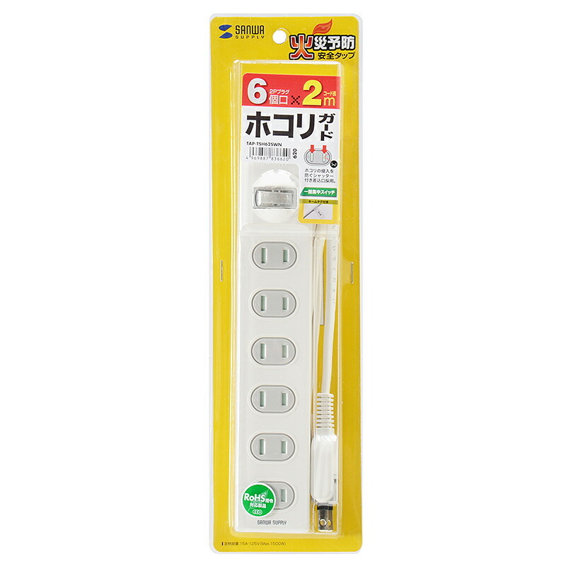 ホコリ防止シャッター、トラッキング火災予防の6個口集中スイッチ付き安全タップ。2P・2m。