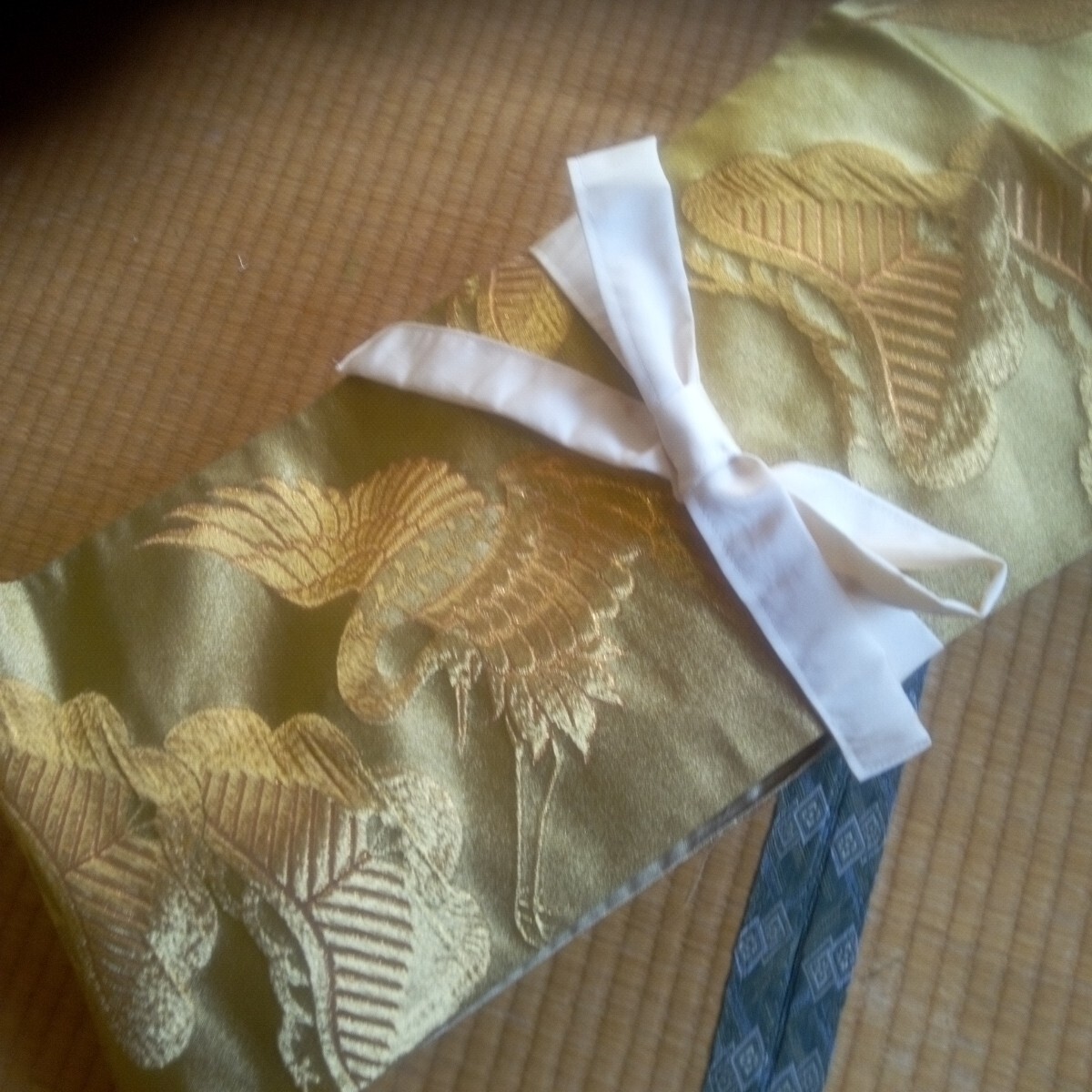 黒金色の地に金彩鶴松柄の刺繍の振袖用の豪華な袋帯から作りました。普段使いというよりは、インテリアにもなるゴールドのお祝いの席のカバーです。