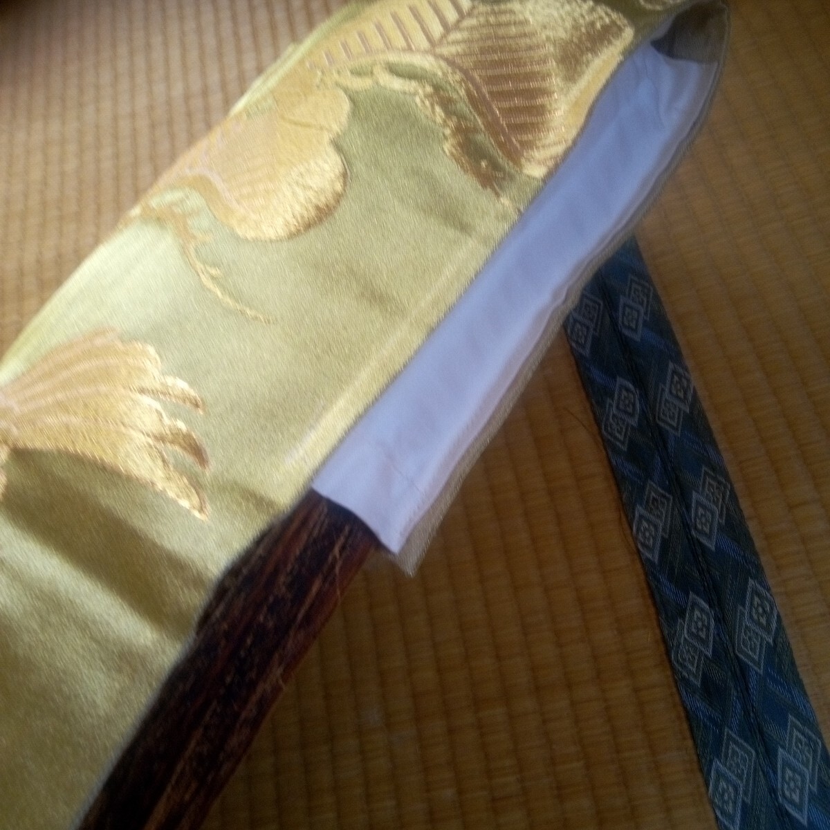 片方は幅6センチ深さ30センチほどの袋状、片方は幅4.5センチ長さ80センチのひもになっています。