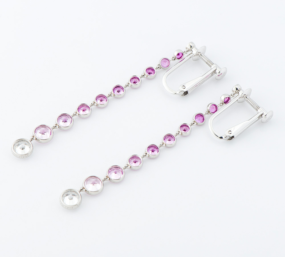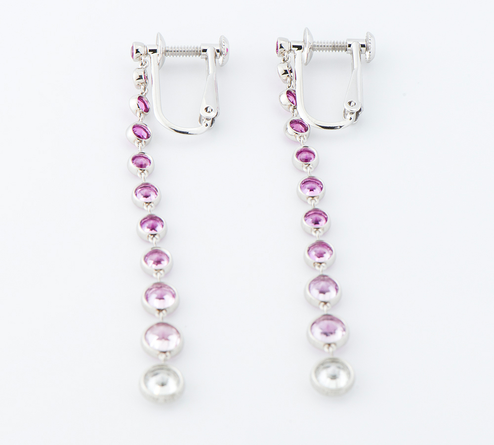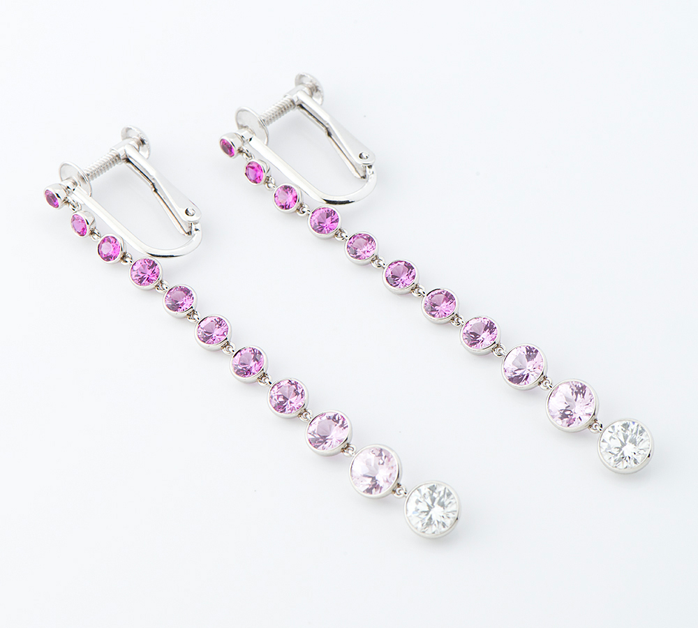 ため息がでるほどに美しい、ベゼルセッティングした計1.904/1.835ctのピンクサファイアと大粒ダイヤモンドを連ねた上質なイヤリング。濃く鮮やかなピンクサファイアから、色をグラデーションさせながら徐々にサイズアップし、最後に0.519/0.505ctの上質なダイヤモンドをセットした何とも贅沢なデザイン。グラデーションに対する色のこだわりは数々のギメル作品を見れば一目瞭然ですが、一切の妥協を許さない姿勢にただただ圧倒されるばかり。ゆらゆらと大きく揺れ眩い煌めきを放つ、優雅でラグジュアリーなジュエリーです。