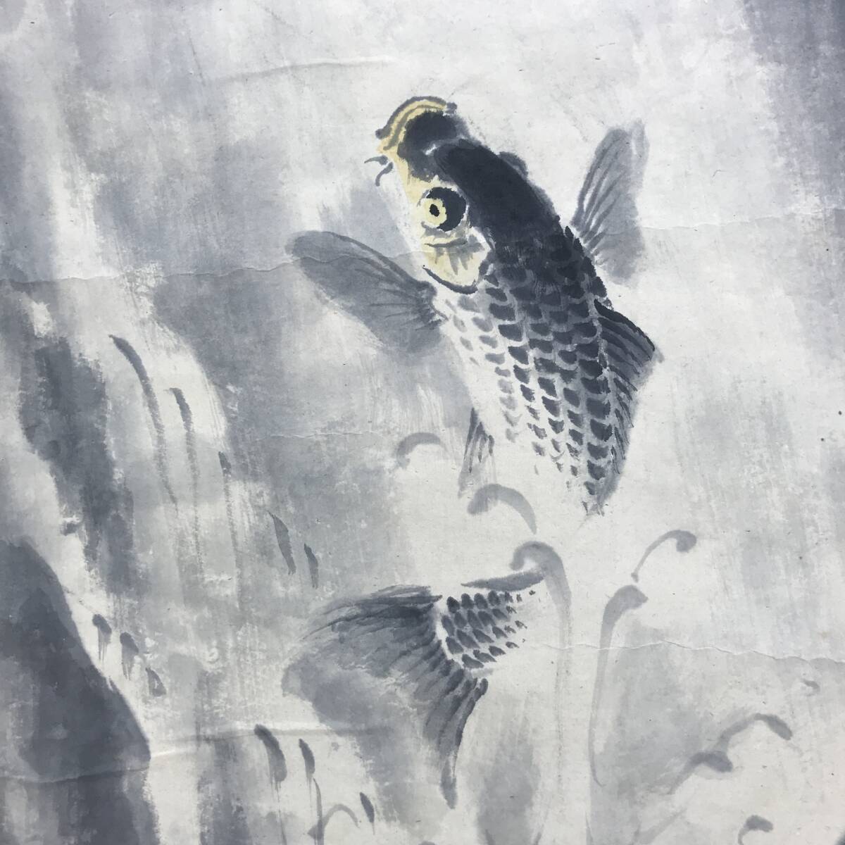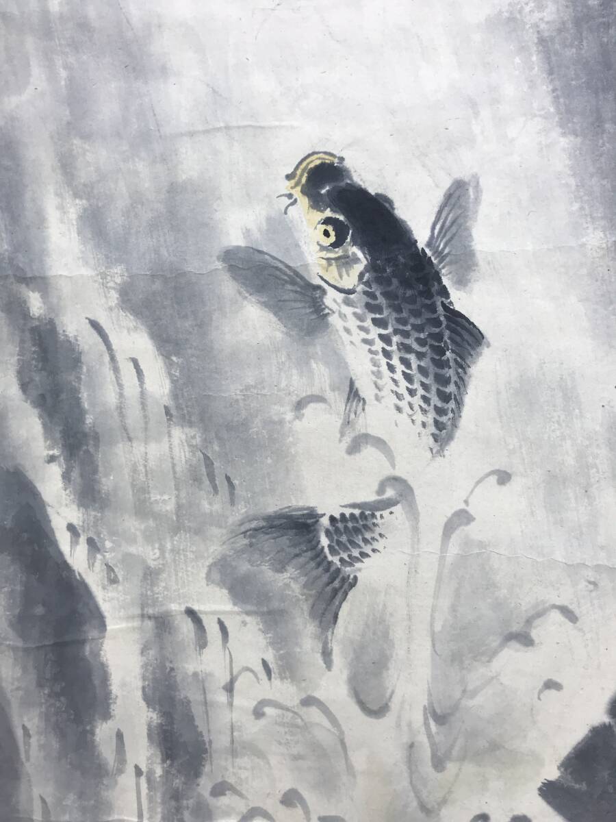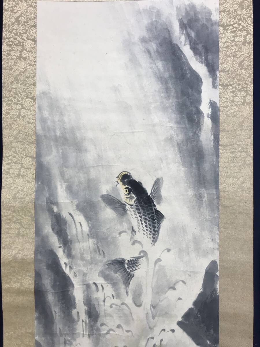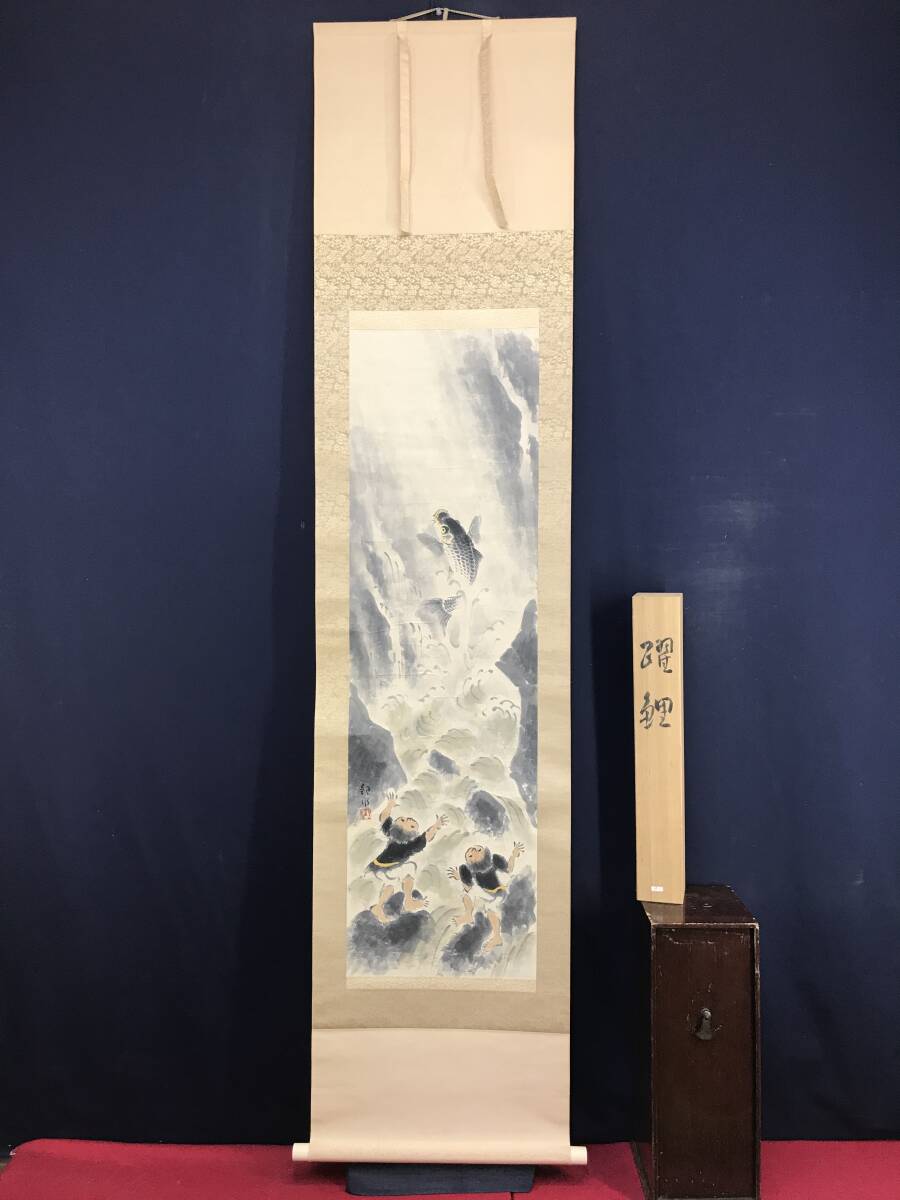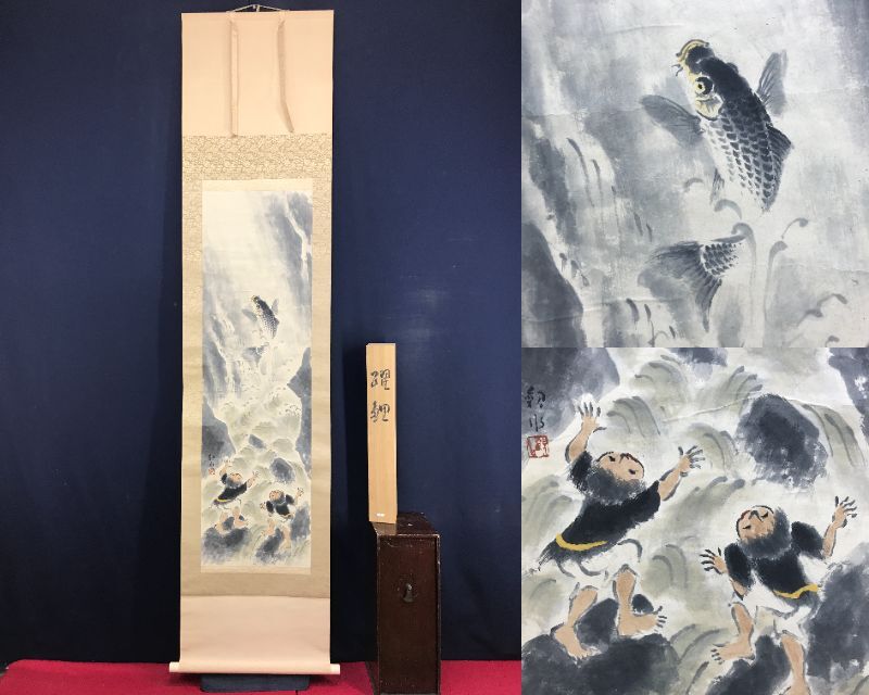 真作/四田観水/鯉滝昇之図/跳鯉/鯉滝登り図/登龍門図/コイ図/花鳥図/掛軸☆宝船☆AG-535