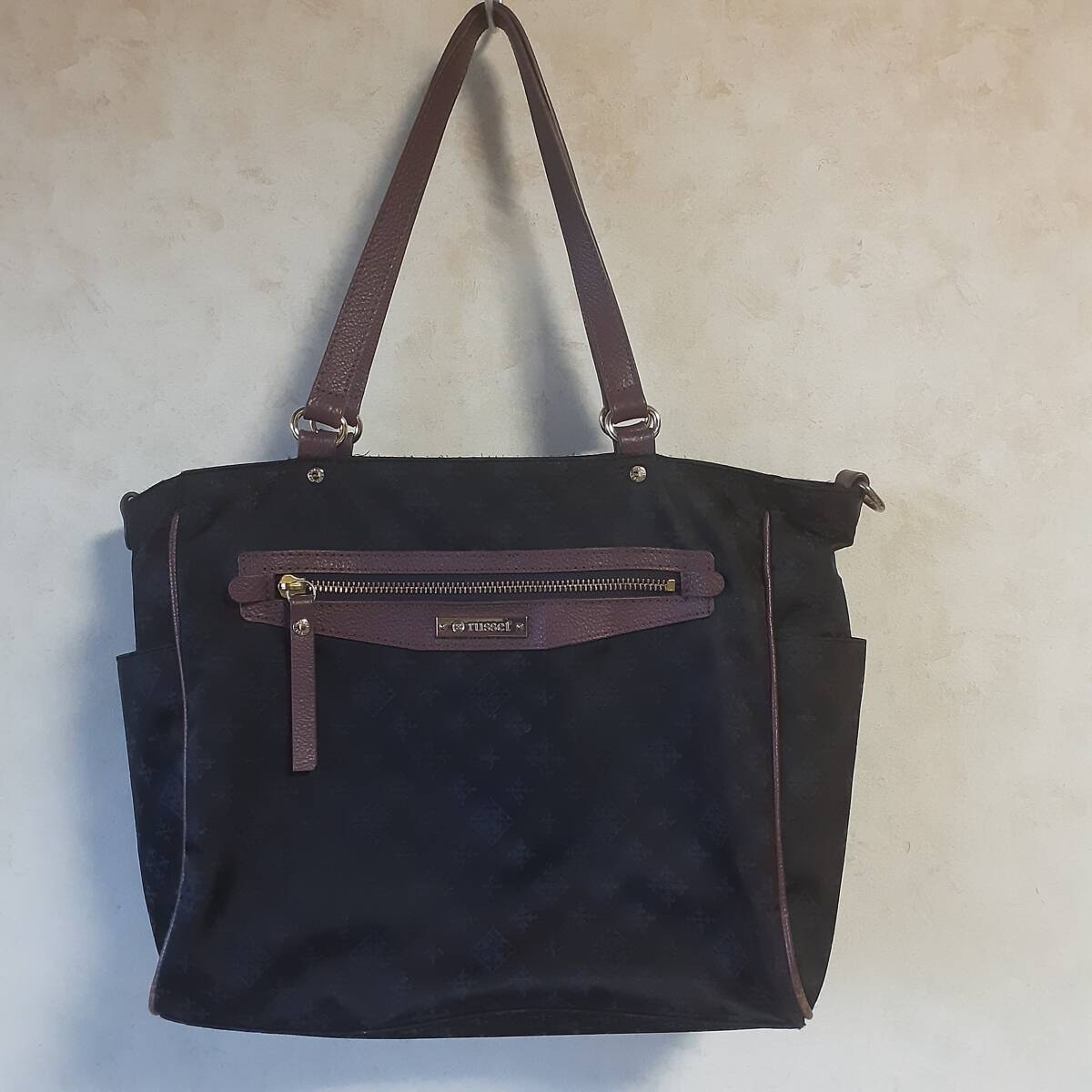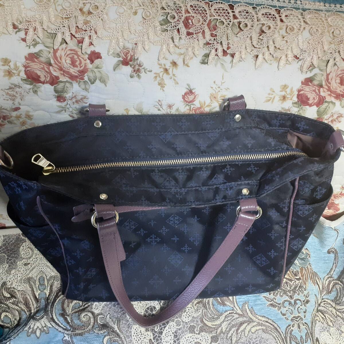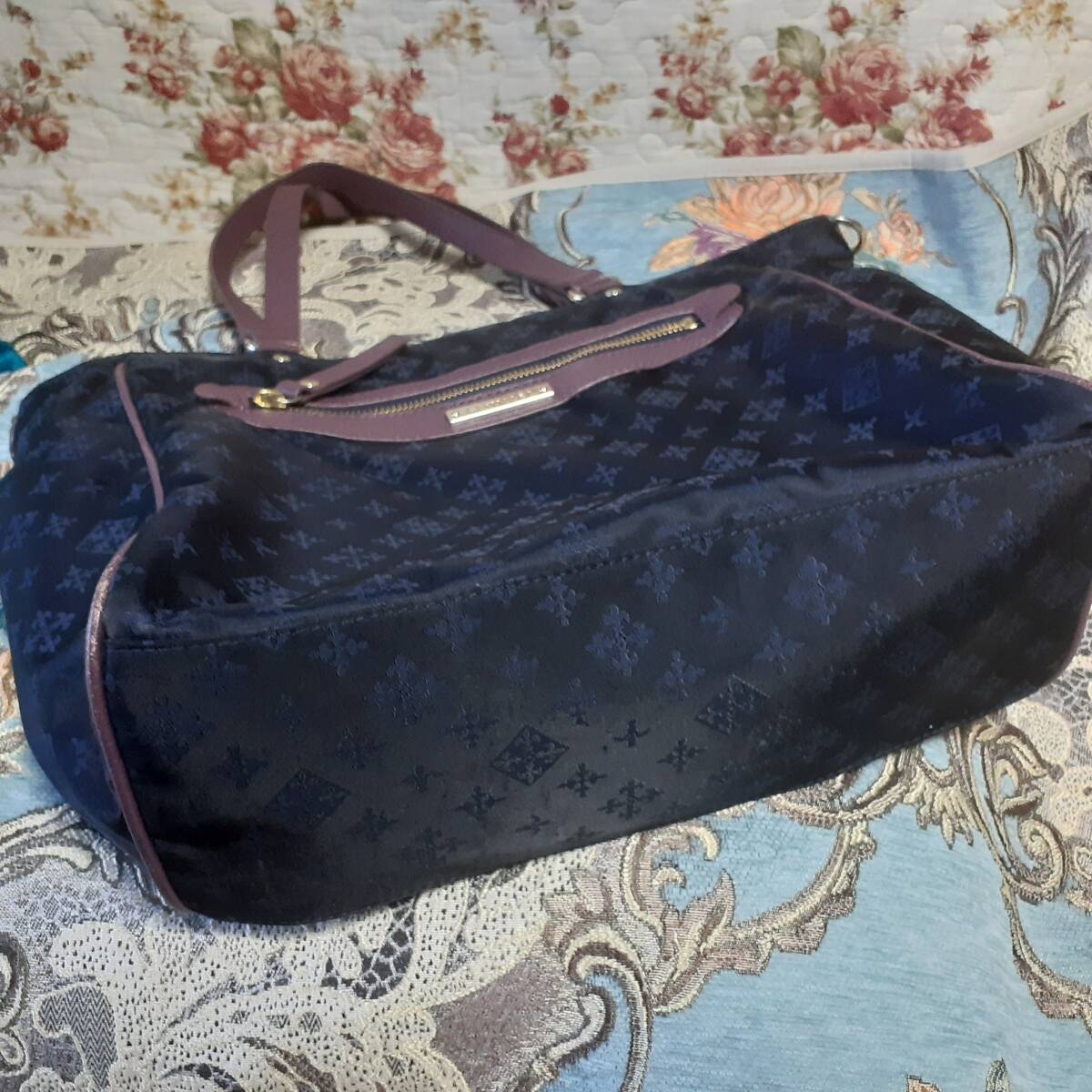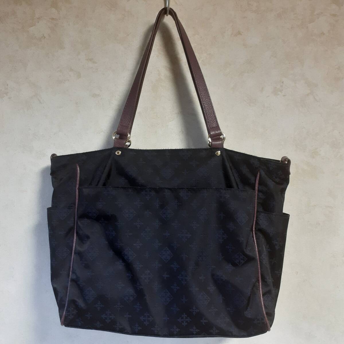 モノグラム柄ジャガード生地のトートバッグに、モノグラム柄の型押しをほどこした牛革を前面に配したポーチをセット。