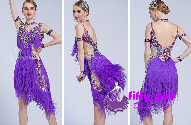新品fifty_youレディース社交ダンス ラテン競技&試合高級手作りドレス  セミオーダー  素敵花柄付 パープル  ラテンワンピース