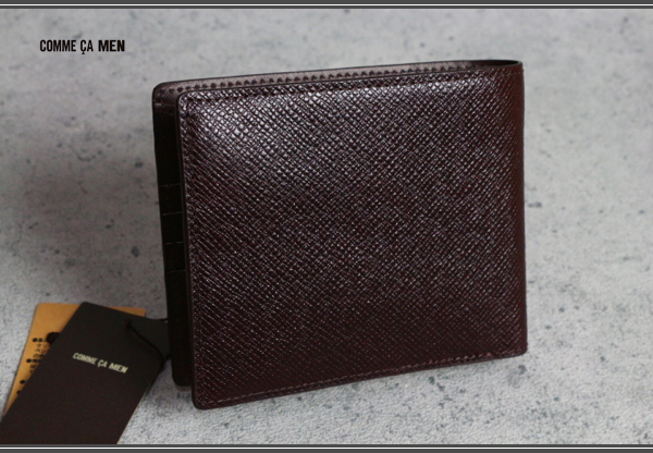 コムサ系のメインブランド、コムサメン(COMME CA MEN)のシボ型押しレザー二つ折り財布。