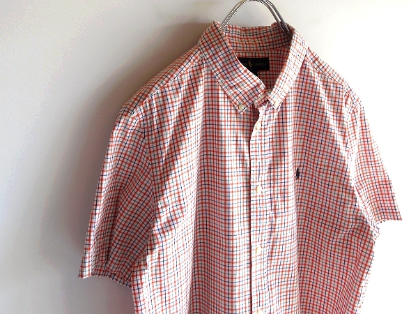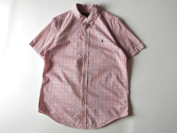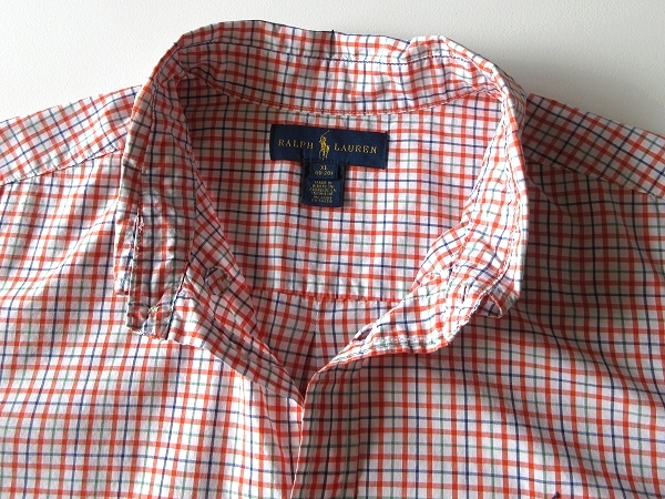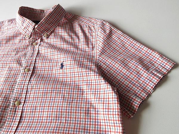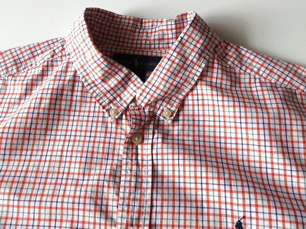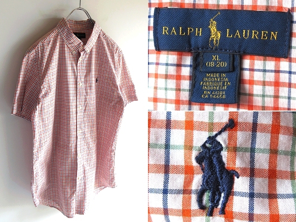 ネコポス対応 RALPH LAUREN ラルフローレン ポロポニーロゴ刺繍 コットン チェック 半袖 BDシャツ XL 18-20 メンズS程度 オレンジ USA企画