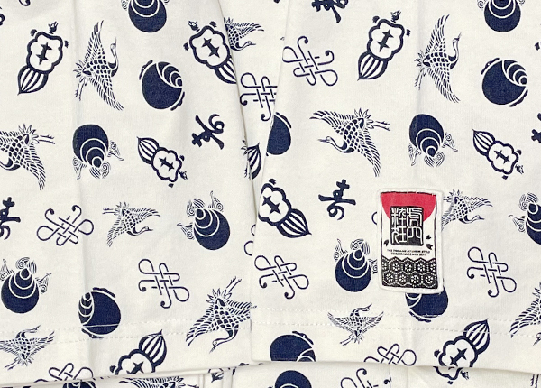 寿や鶴や、とにかくめでたい象徴とされるモチーフを全面にプリントした個性溢れるデザイン。