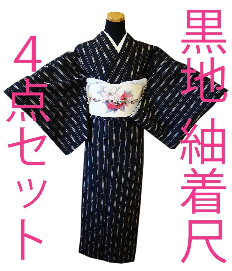 ★美品◆帯や小物次第で様々な表情をお愉しみ頂ける逸品!! 洒落感溢れる黒地の紬着尺&なごや帯&帯揚げ・帯〆の豪華4点セット(正絹) I120★ | |
