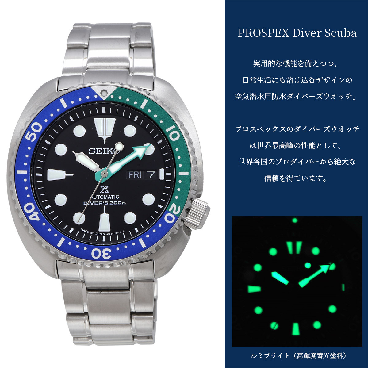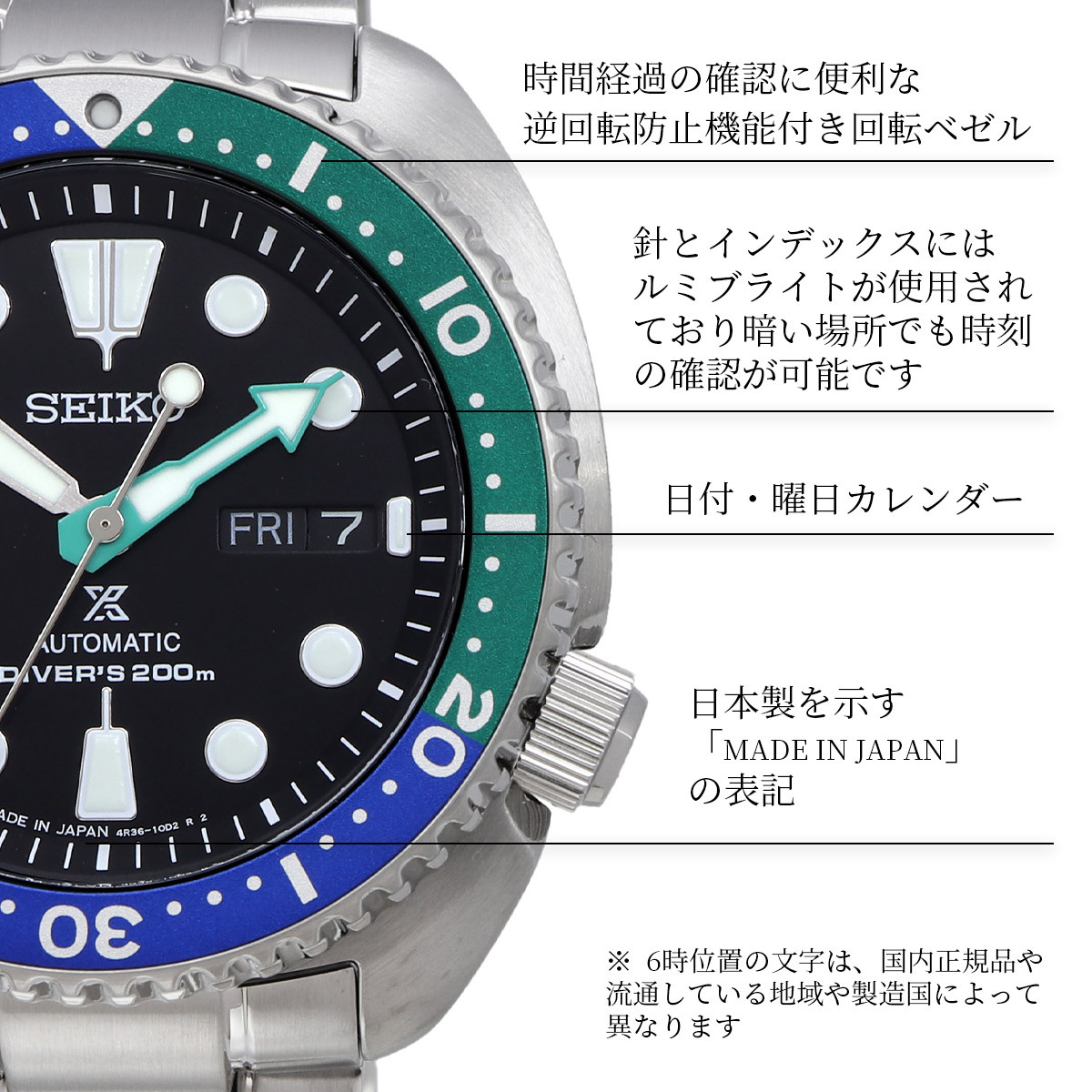 機能 | 3針、カレンダー(曜日・日付)、ねじロック式りゅうず、逆回転防止ベゼル、ルミブライト(針、インデックス)、ハック機能 |