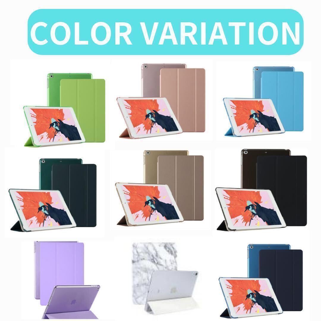 バックケースは、三つ折りフロントカバーと同じ色合いの半透明色で、Appleのロゴマークのリンゴがうっすらと透けて見えます。
