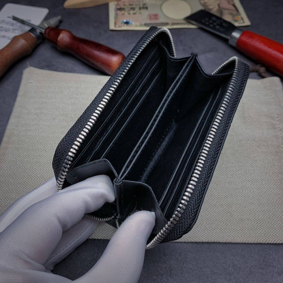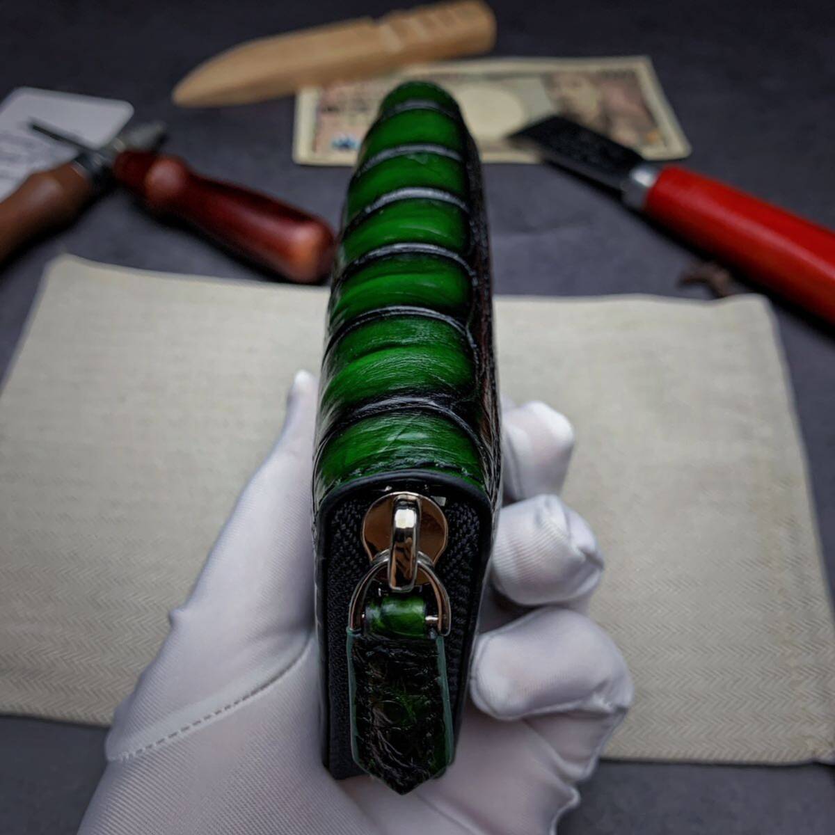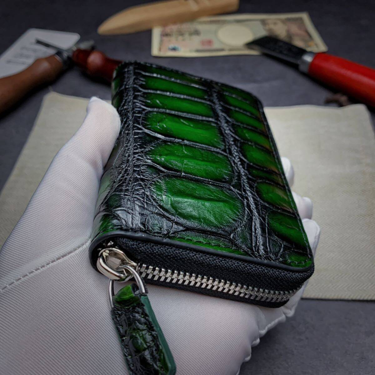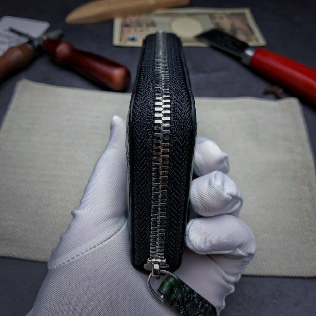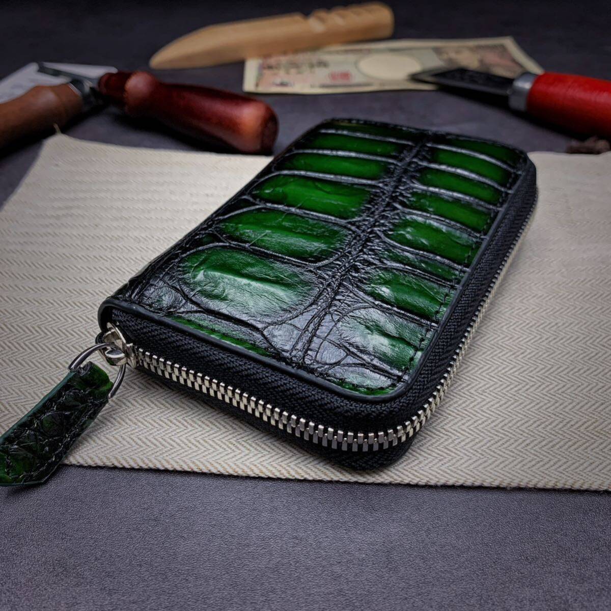 ハンドメイドで作る一枚革のクロコダイルラウンドファスナーウォレット、鱗のラインがとても立体的で強く印象づけてくれています。内装には牛革を使うことで、高級感と清潔感が与えてくれます。