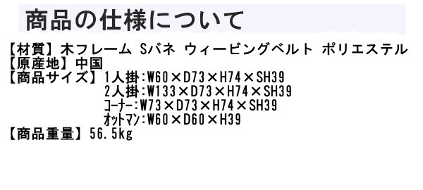 ![]() Amul アムール カウチソファ ベージュ 商品の仕様について 【材質】木フレーム Sバネ ウィービングベルト ポリエステル 【原産地】中国 【商品サイズ】1人掛:W60×D73×H74×SH39 2人掛:W133×D73×H74×SH39 コーナー:W73×D73×H74×SH39 オットマン:W60×D60×H39 【商品重量】56.5kg ◇◆発送について◆◇
