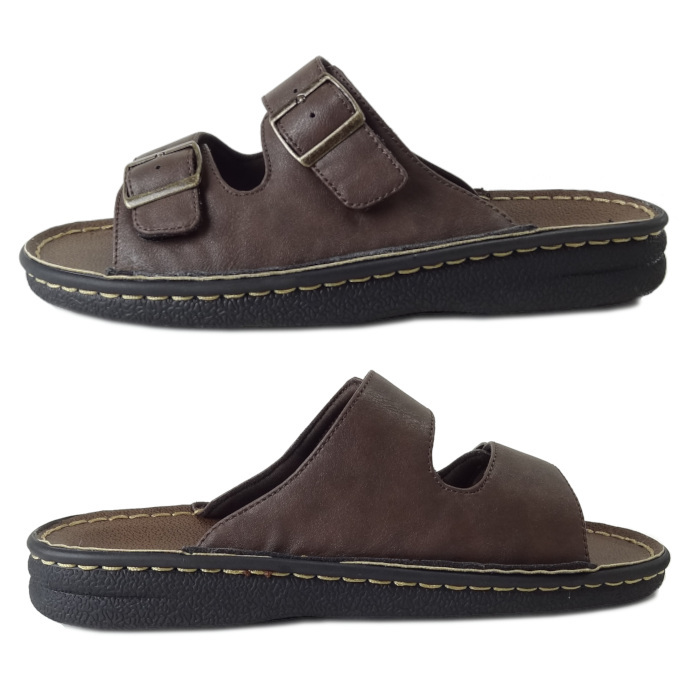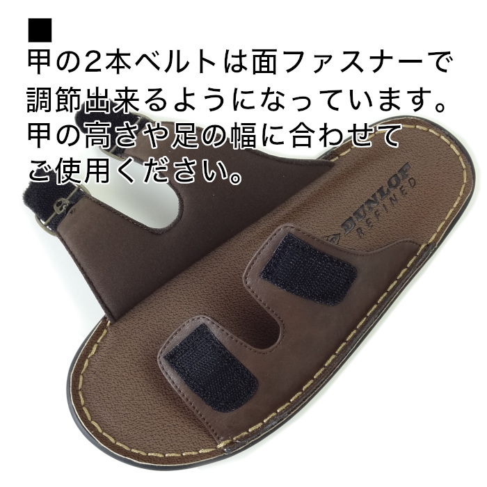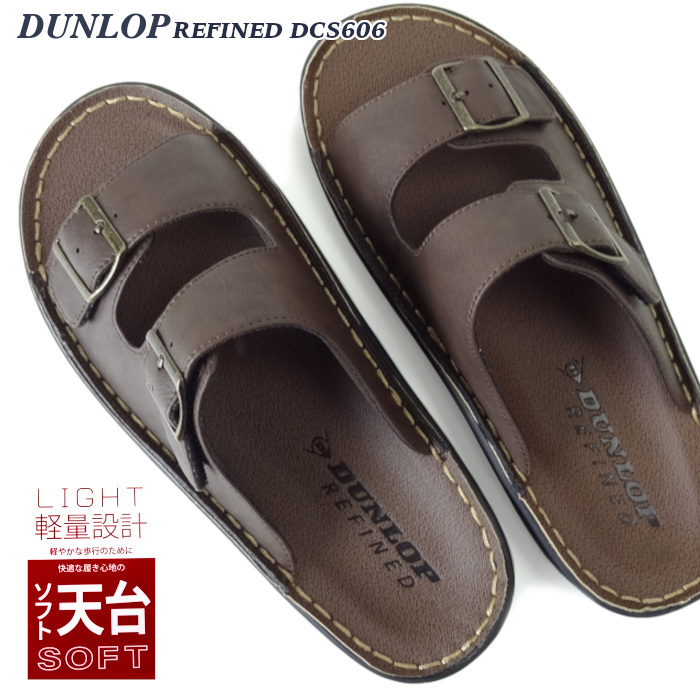 ブランド名: DUNLOP REFINED ダンロップリファインド 品名:S606 品番:DCS606 色:ブラウン 茶色 サイズ:M(25.0~25.5cm) 素材: アッパー/合成皮革 ソール/EVA+ラバー 生産国:中国 軽量設計:軽い素材であるEVAなどを靴底に使用し軽量化しています。 一年中履ける2本ベルトのメンズサンダルです。ソフトな素材が優しく足を包み込んでくれるような履き心地です。 アッパーとインソール、アウトソールを糸で縫ってあるので丈夫で耐久性にも優れています。 庭やベランダ、普段履きから屋内などの仕事用、オフィス履きなどに最適です。お誕生日などのプレゼント、贈り物などにもいかがでしょうか! | ||