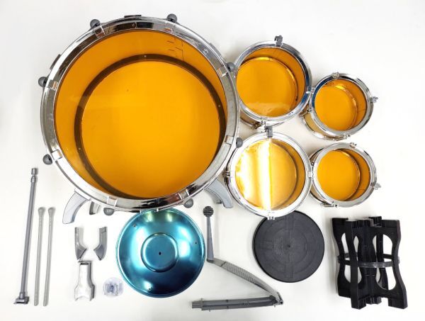 5つのドラムとシンバル、スティック、イスもついた本格派! おうちの中で叩いても大きな音が出ない安心設計! 未来のプロドラマーを目指し叩きまくれ! <セット内容> ●バスドラム:φ400mm×220mm×1 ●ドラム大:φ200mm×110mm×2 ●ドラム小:φ160mm×90mm×2 ●シンバル:φ225mm ×1