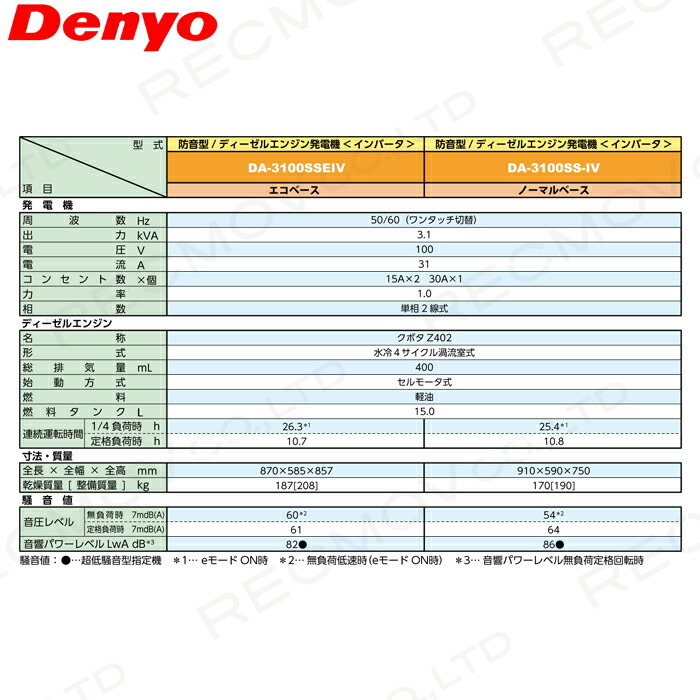 デンヨー インバーター発電機 DA-3100SSEIV 3100W 3.1kVA インバータ発電機 ディーゼルエンジン(軽油)