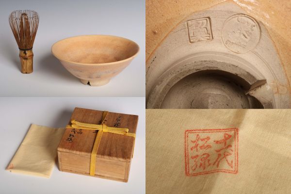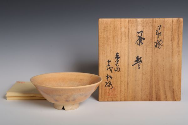 8551 萩焼 窯元 東光山松緑窯 十一代 大和松緑 切高台 萩平茶碗(四方桟共木箱) 茶碗 茶道具