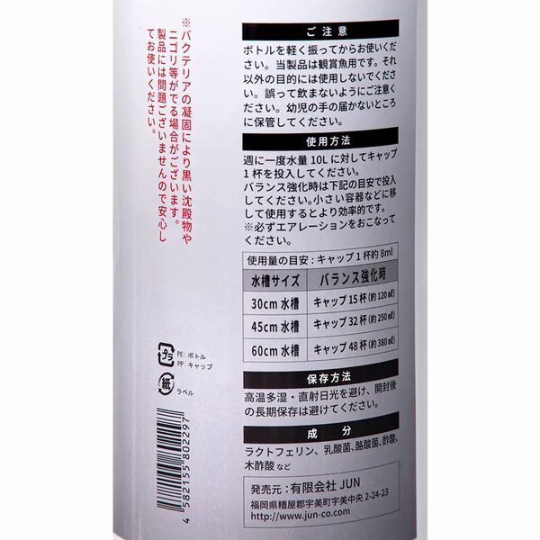 こちらの商品の最安送料による発送方法はレターパックプラスとなります。レターパックプラスのお届けは、通常1~3日程度要します。お急ぎの方は宅配便を選択ください。レターパックプラスは、追跡番号あり、捺印による対面受け渡しとなります。破損補償なし、代引き不可、時間指定なしとなりますのでご注意ください。胃腸からくるバランス不良、雑菌などによる皮膚感染に効果的な調整剤です。理想的なバランス維持、乳酸菌・酢酸菌・酪酸菌などの能力を発揮します。乳酸菌、酪酸菌の働きにより水質のバランスを整えコケの抑制、消臭効果があります。ラクトフェリン配合。ビタミン生成をサポートします。