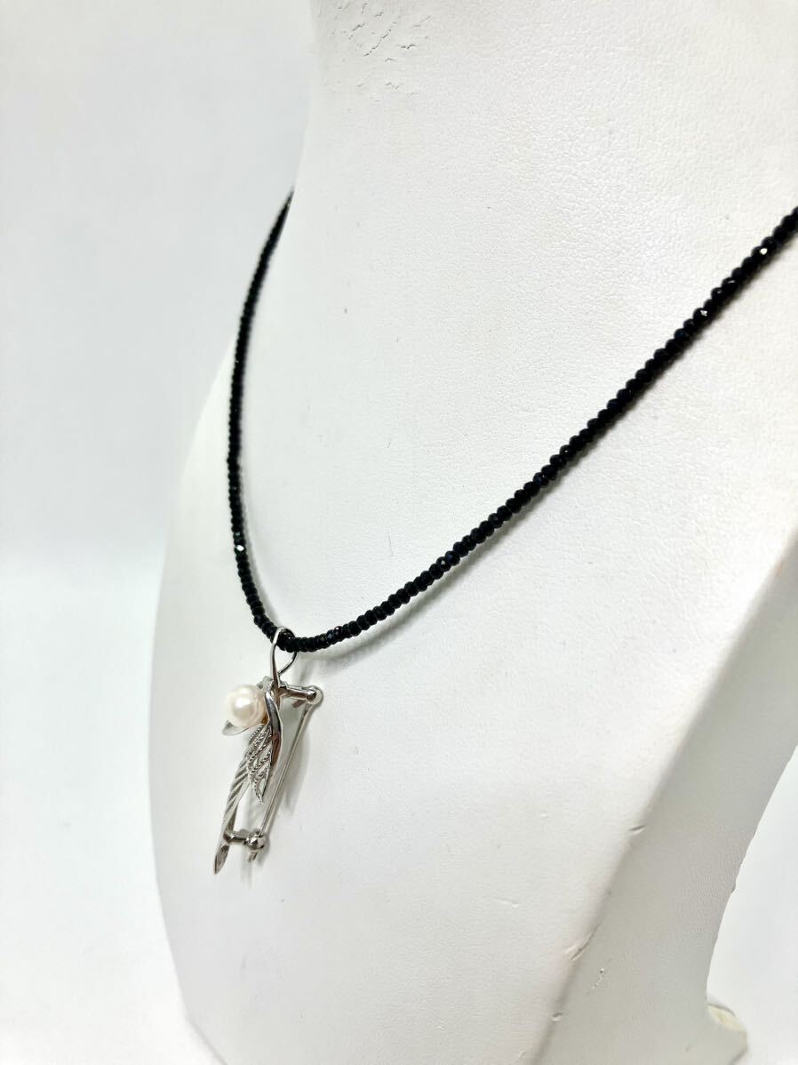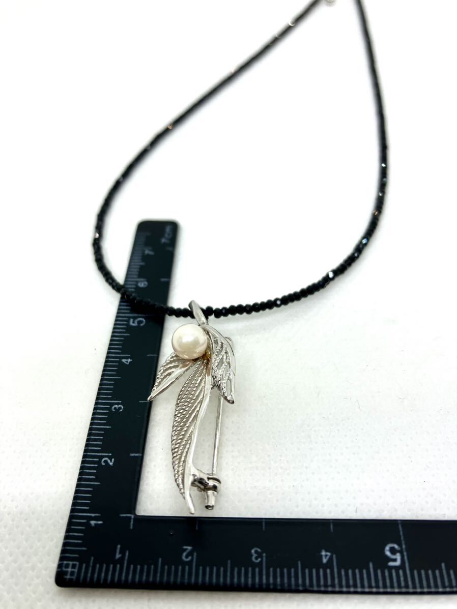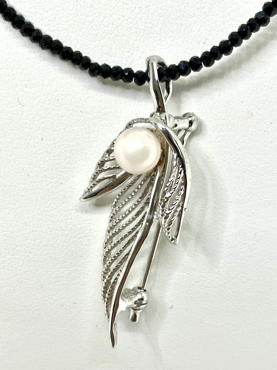 新品のアコヤのベビーパールデザインペンダントトップ兼ブローチネックレスです。ペンダントトップをブラックスピネルに通したネックレスです。