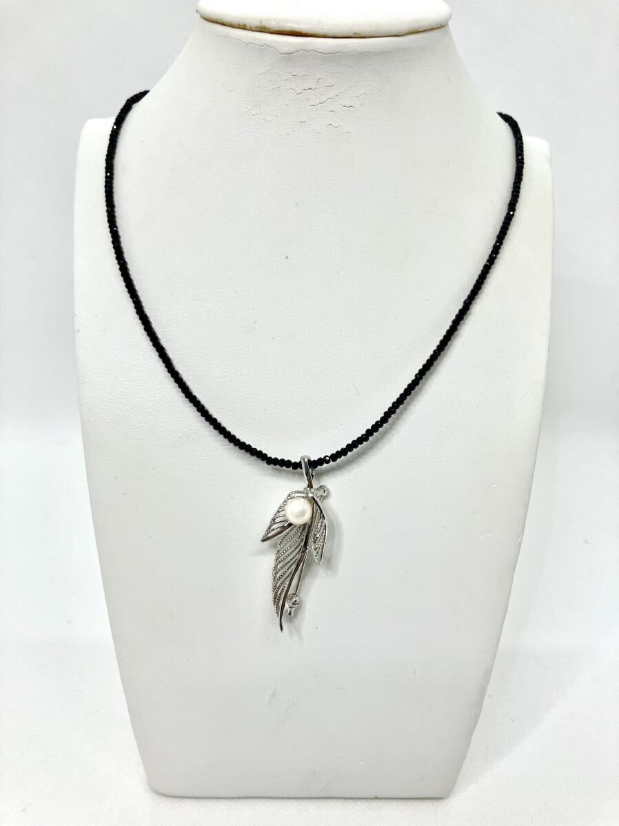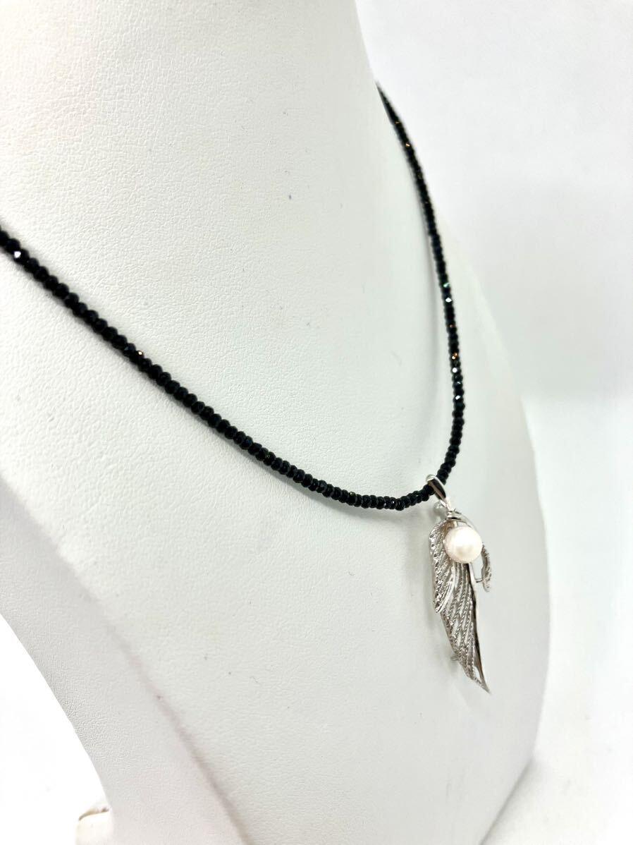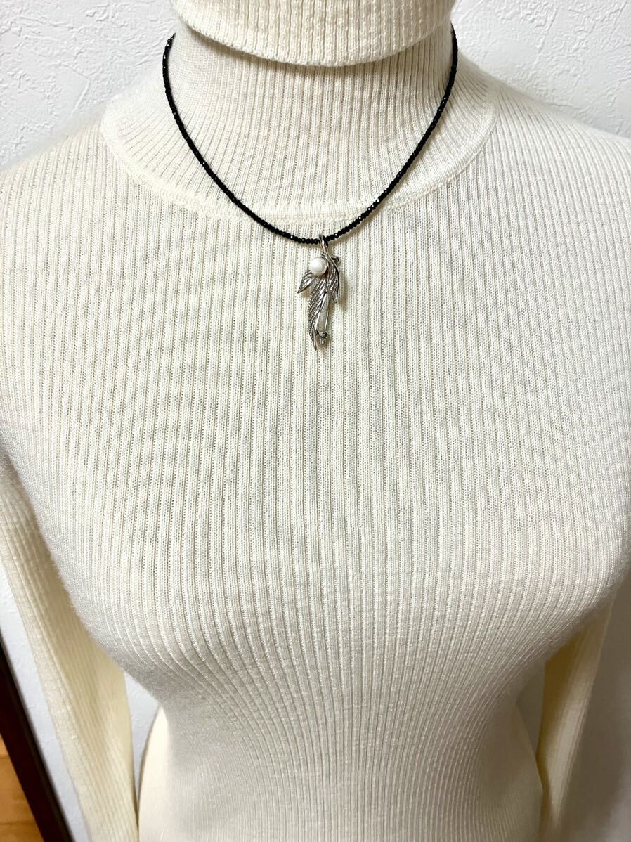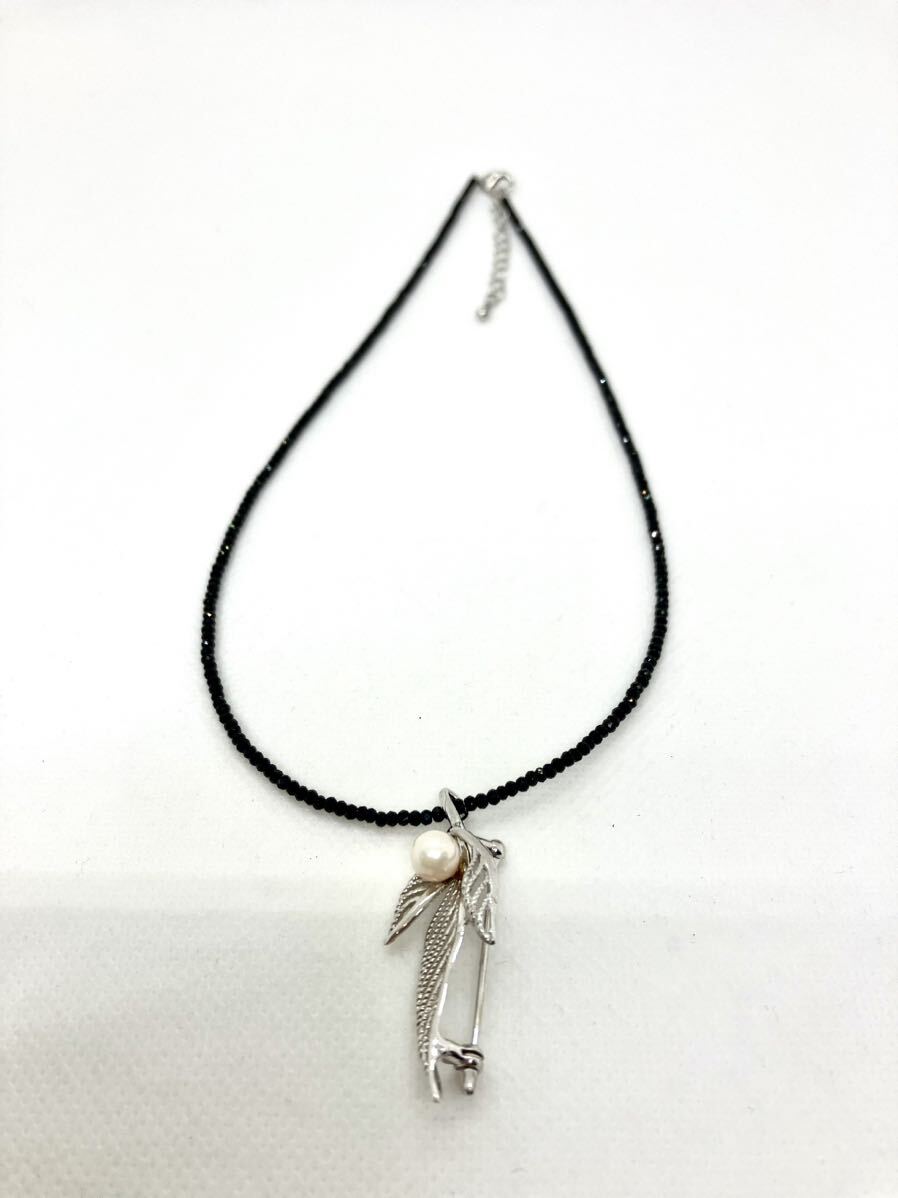 新品のアコヤのベビーパールデザインペンダントトップ兼ブローチネックレスです。ペンダントトップをブラックスピネルに通したネックレスです。