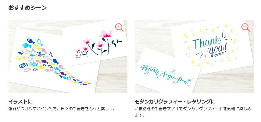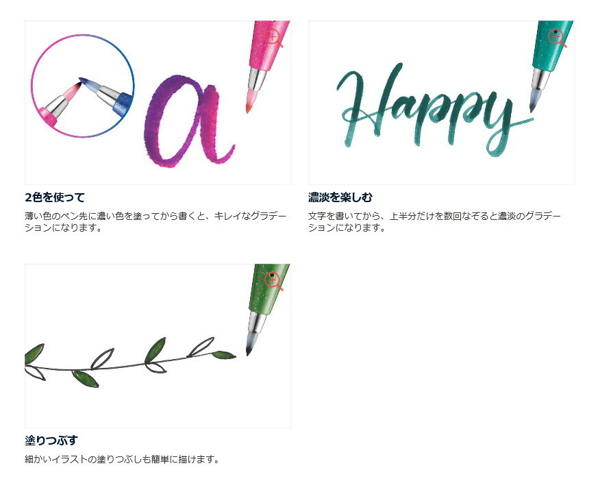 柔らかすぎず、適度なしなりがあるペン先なので、筆ペンに慣れていない方でも扱いやすいです。力の入れ具合で筆記線幅を自由に変えることができるので、抑揚のある文字が書けるのはもちろん、イラストなどを塗りつぶす際にもはみ出さずにきれいに塗れます。