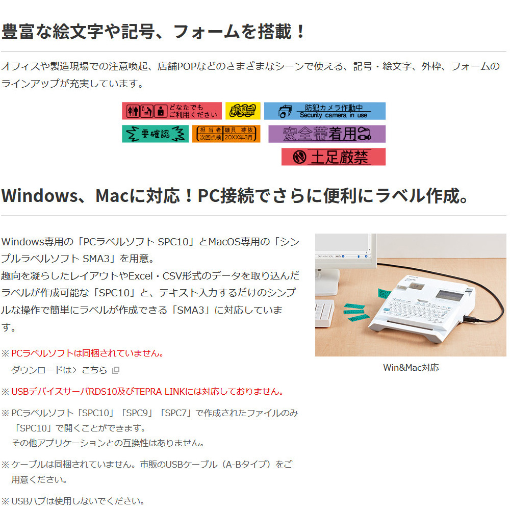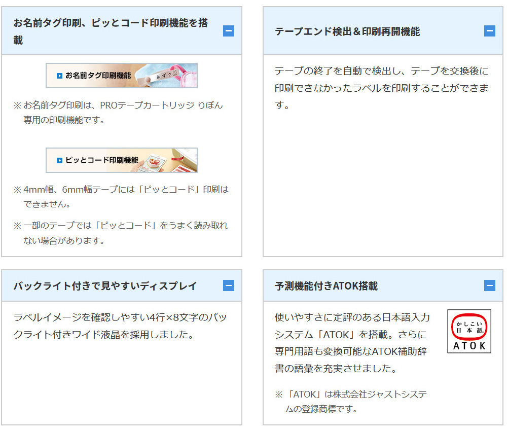 「お名前タグ印刷」「ピッとコード印刷機能」を搭載。テープエンド検出&印刷再開機能。バックライト付きで見やすいディスプレイ。予測機能付きATOK搭載。Windows、Macに対応、PC接続でさらに便利にラベル作成。