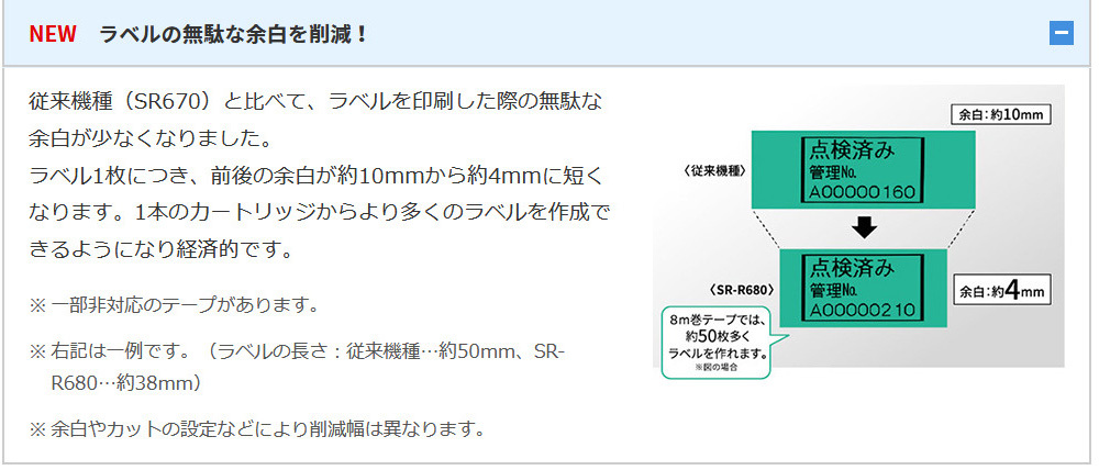 ラベルを印刷した際の前後の無駄な余白が少なくなり、1本のカートリッジからより多くのラベルが印刷できるようになりました。従来機種と比べ、ラベル1枚につき前後の余白が約6mm短くなり、8m巻テープでは約50枚多くラベルを作れます(SR670と比較した場合)。