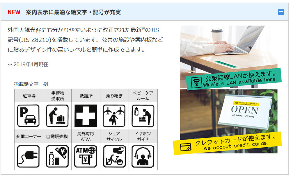 外国人観光客にも分かりやすいように改正された最新のJIS記号を搭載しています。公共の施設や案内板などに貼るデザイン性の高いラベルを簡単に作成できます。