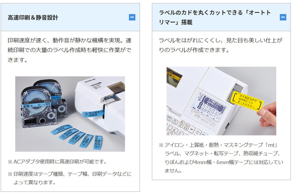 さらに、「ハーフカット機能付きオートカッター」や「オートトーリマー」、「連続印刷」などの機能を搭載するなど、オフィスシーンでの使いやすさを追求したモデルです。書体は漢字8書体・かな12書体・英数14書体を搭載し、デザイン性の高いラベルを作成できます。