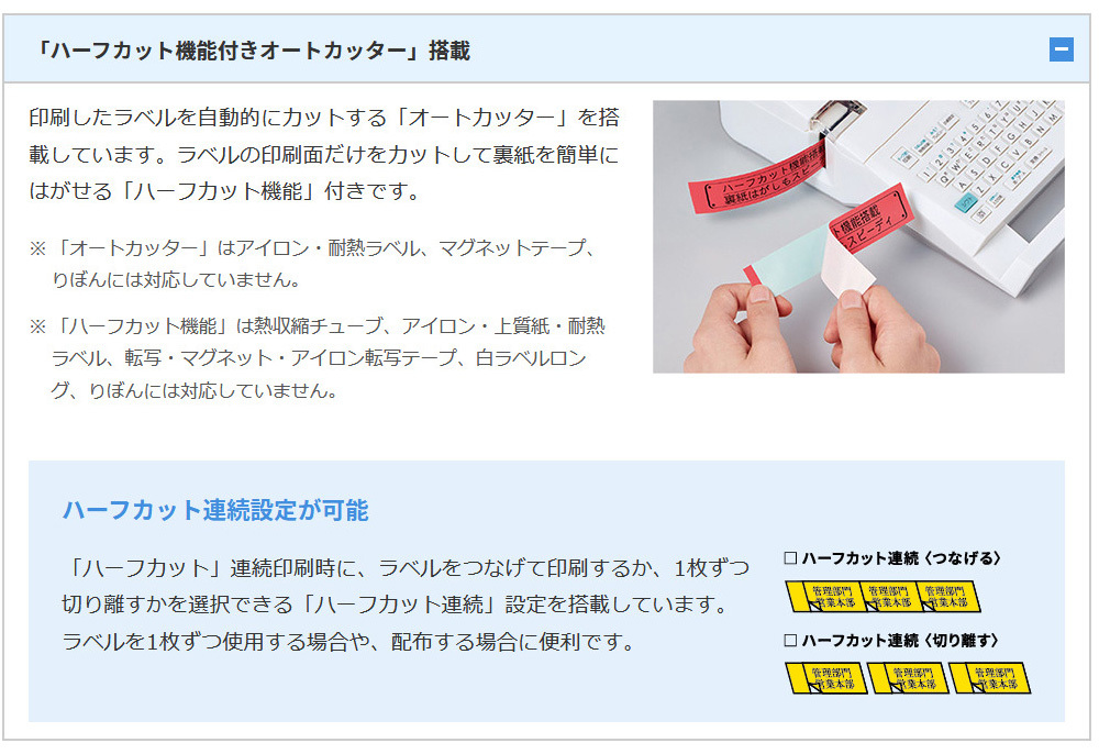 ※「ハーフカット機能」は熱収縮チューブ、アイロン・上質紙・耐熱・カットラベル、転写・マグネット・アイロン転写テープ、白ラベルロング、りぼんには対応していません。