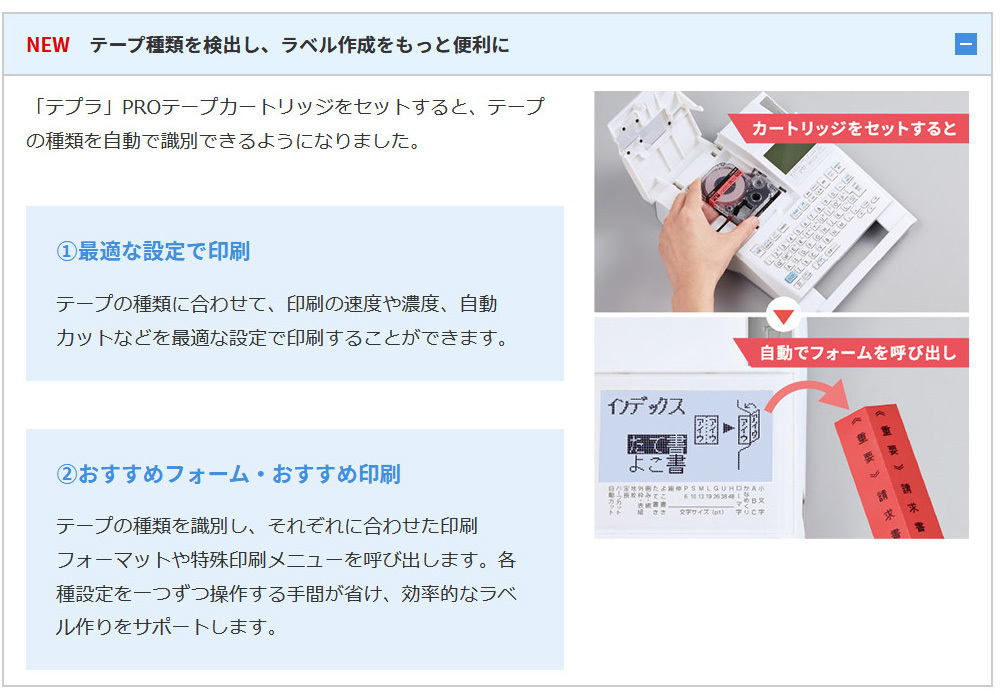 「テプラ」PROカートリッジをセットすると、テープの種類を自動で識別できるようになりました。印刷の速度や濃度、自動カットのON・OFFなどを最適な設定で印刷します。また、テープに合わせた印刷フォーマットや特殊印刷メニューを自動で呼び出すため、各種設定を操作する手間が省けます。
