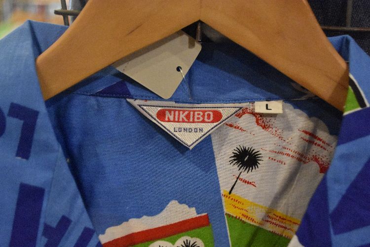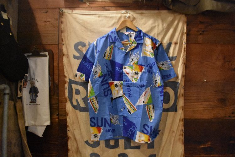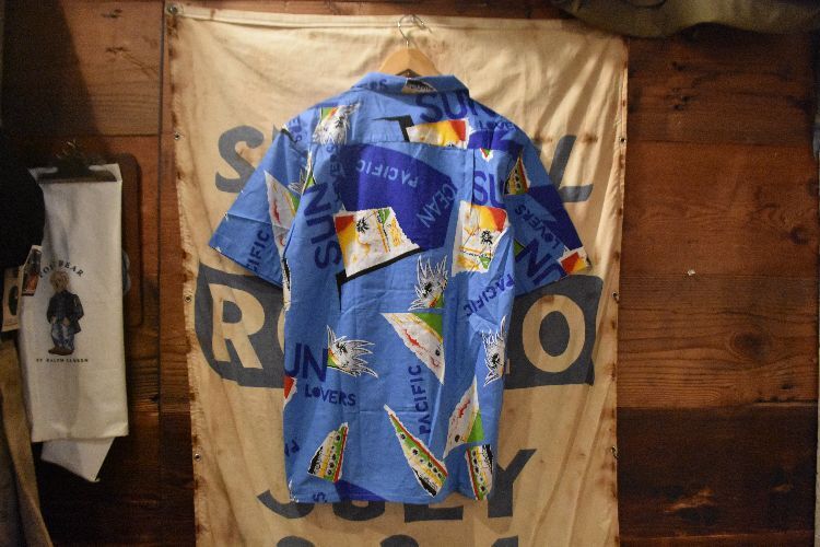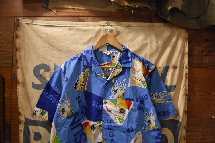 グッドカラーデッドストック品未使用品80S~ビンテージNIKIBO LONDON半袖ハワイアンシャツアロハシャツ青系ブルー系Lアメカジn24597