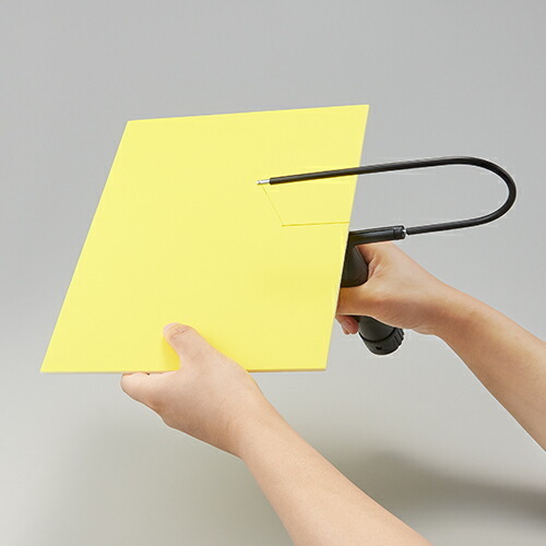 ○使う場所を選ばない乾電池式の発泡スチロールカッターで、スイッチから手を離すと電源が切れる安心設計です。