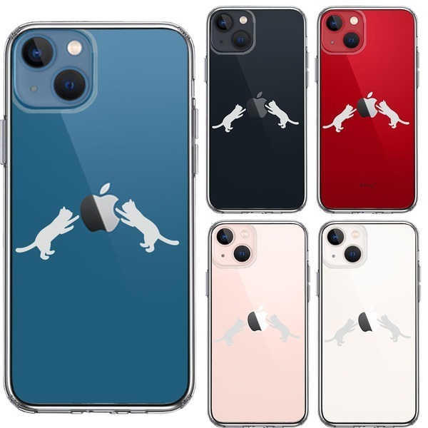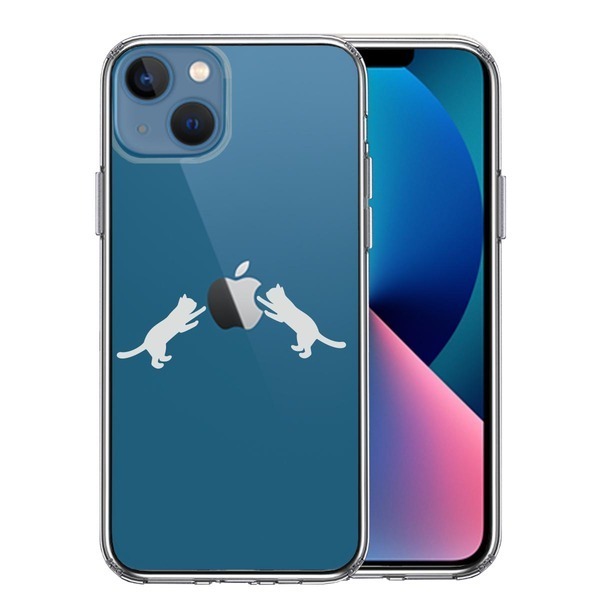 iPhone13 ケース クリアにゃんこ りんご 取り合い 薄いグレー スマホケース 側面ソフト 背面ハード ハイブリッド