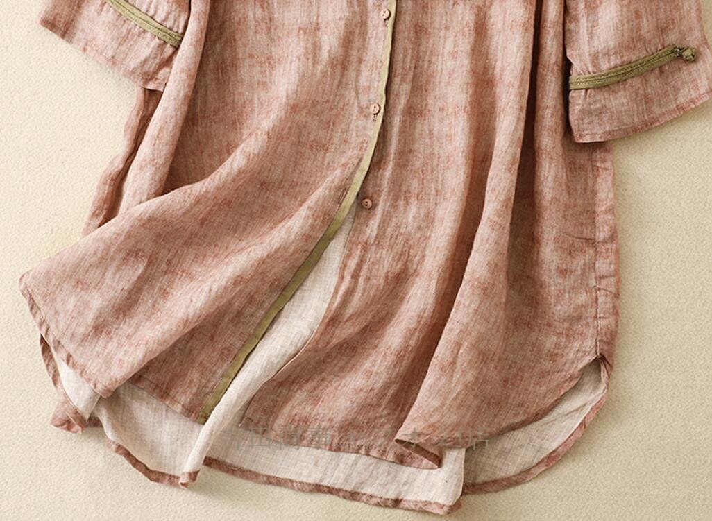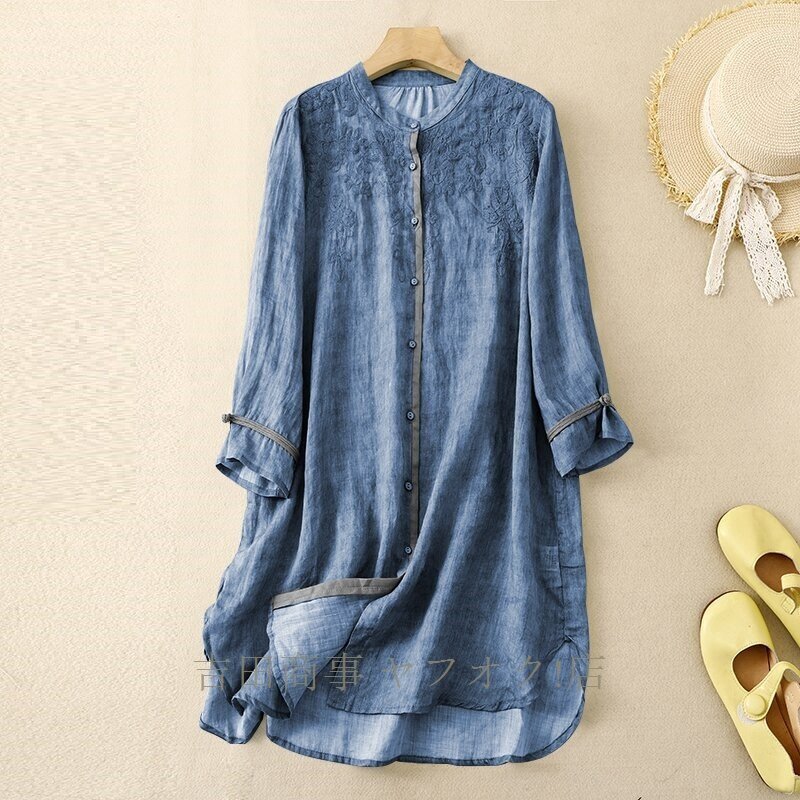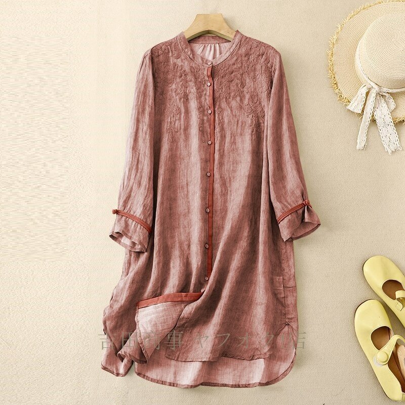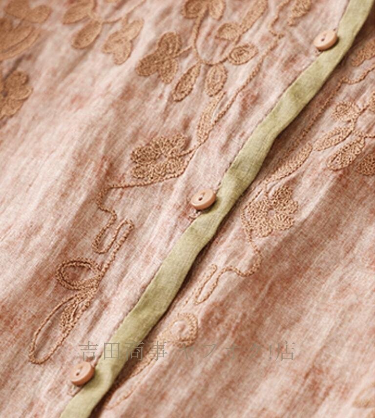 A1010☆新品春夏トップス ロングシャツ チュニック レディース シャツ 花刺繍 花柄 5分袖 大人可愛い カジュアル 綿麻 シャンパン色