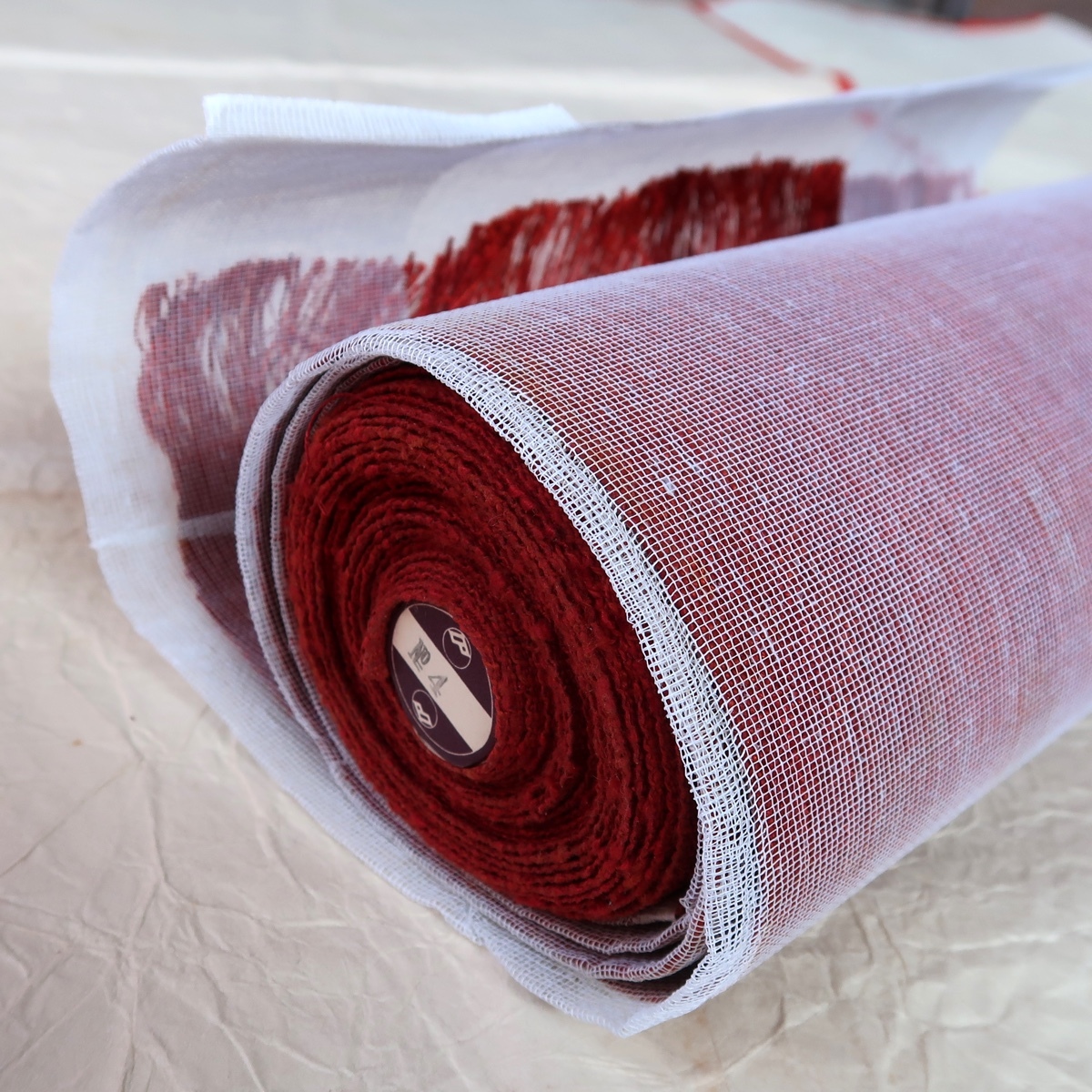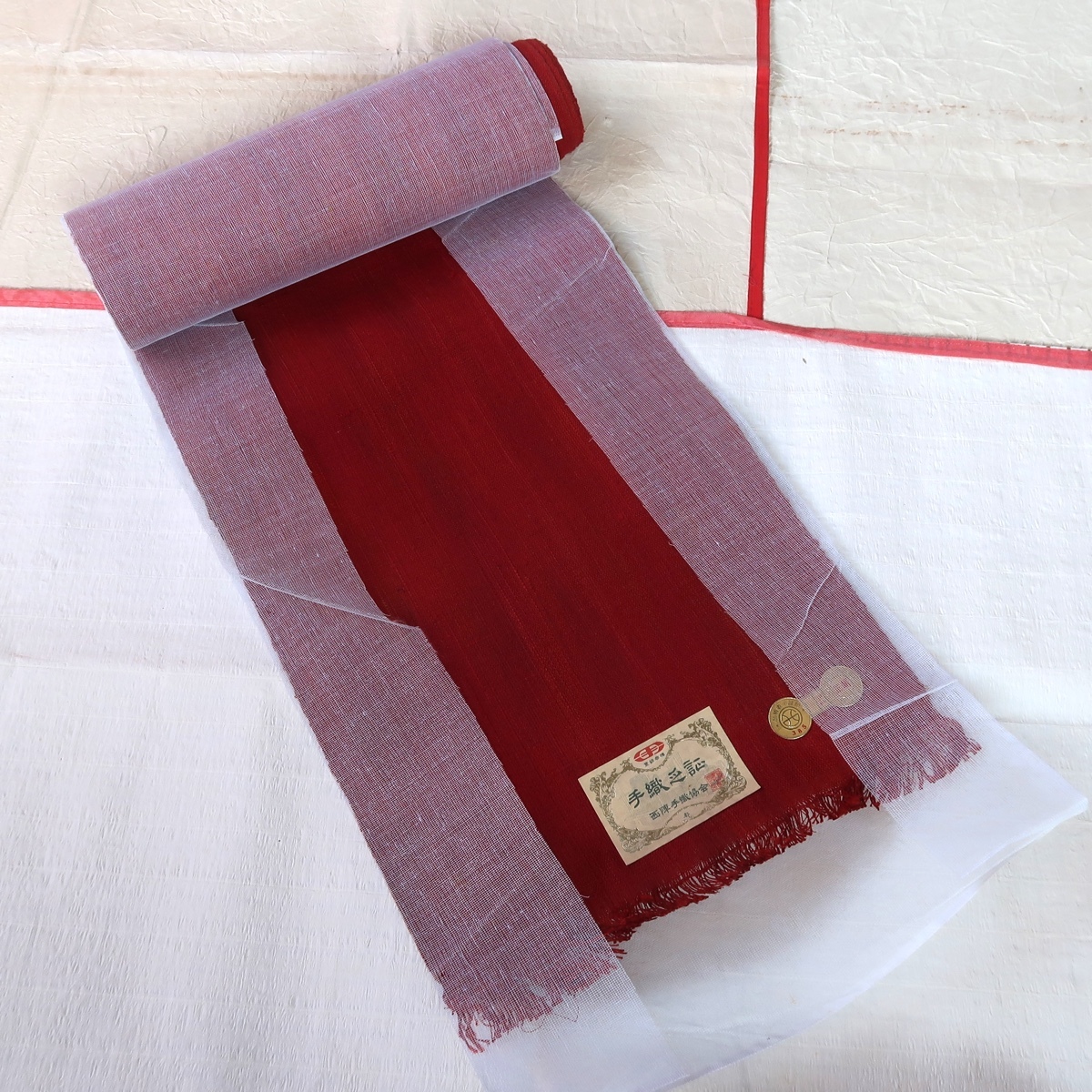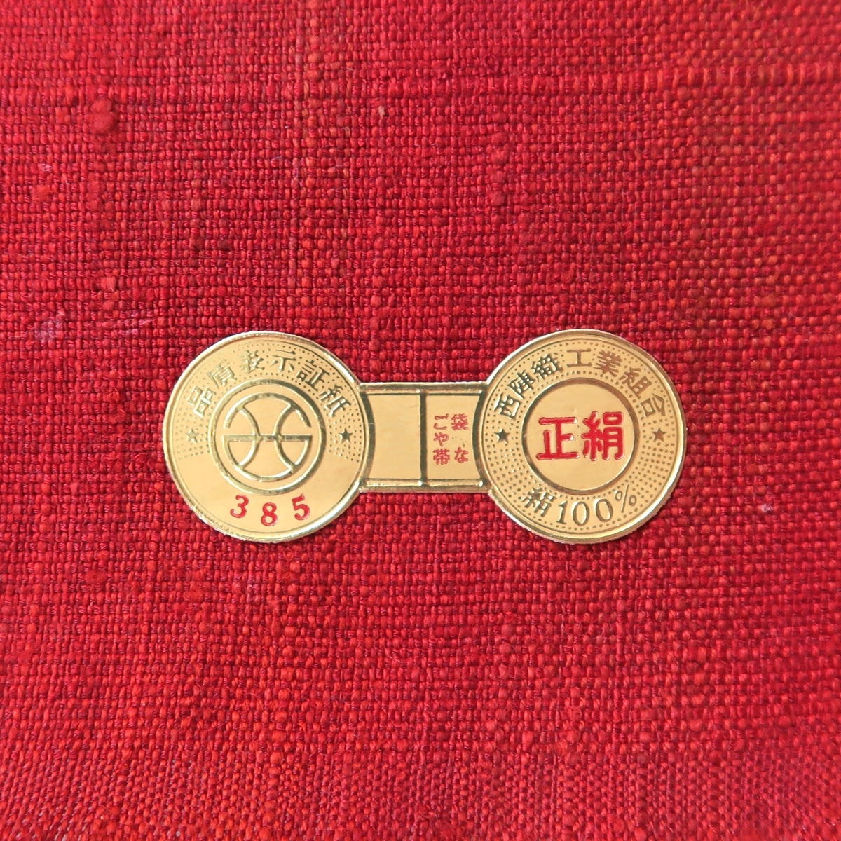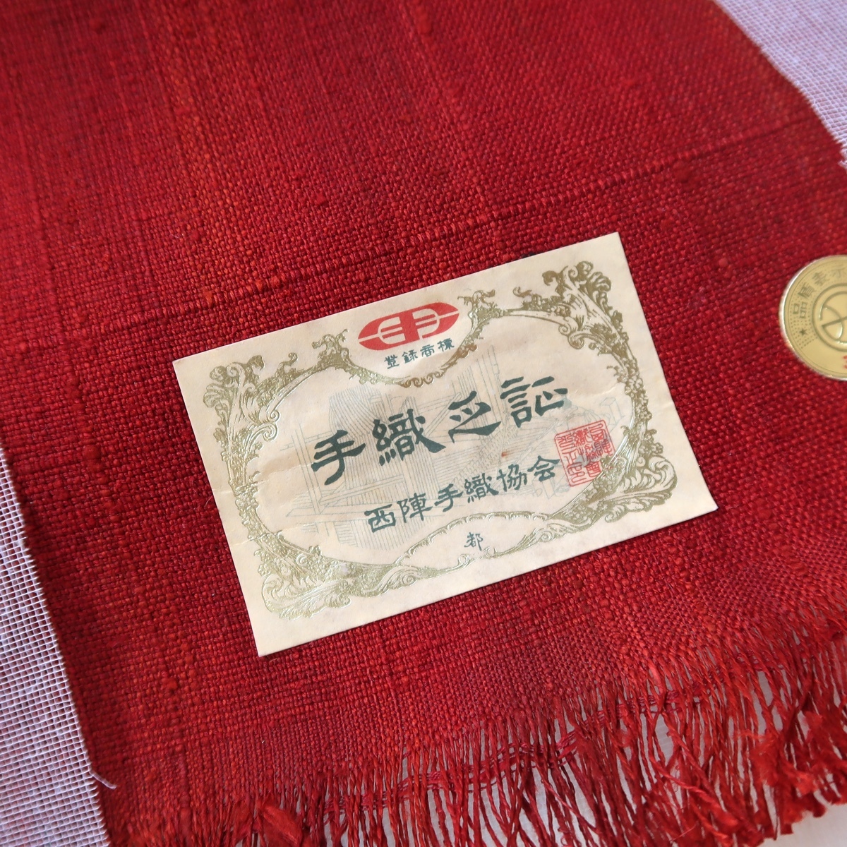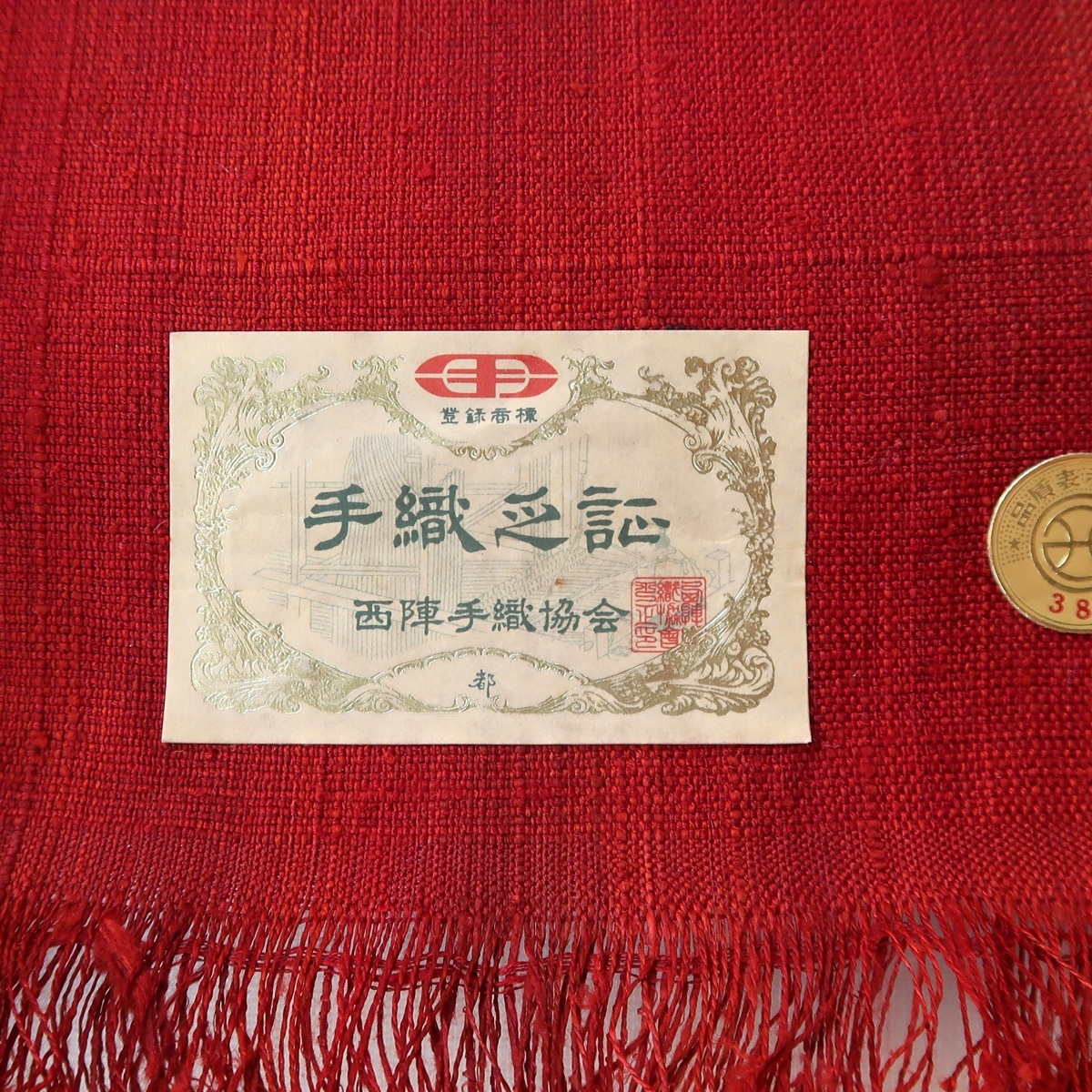 西陣織 都 正絹 絹100% 赤 帯 反物 西陣手織協会 未仕立て 未使用 長期保管品 です。