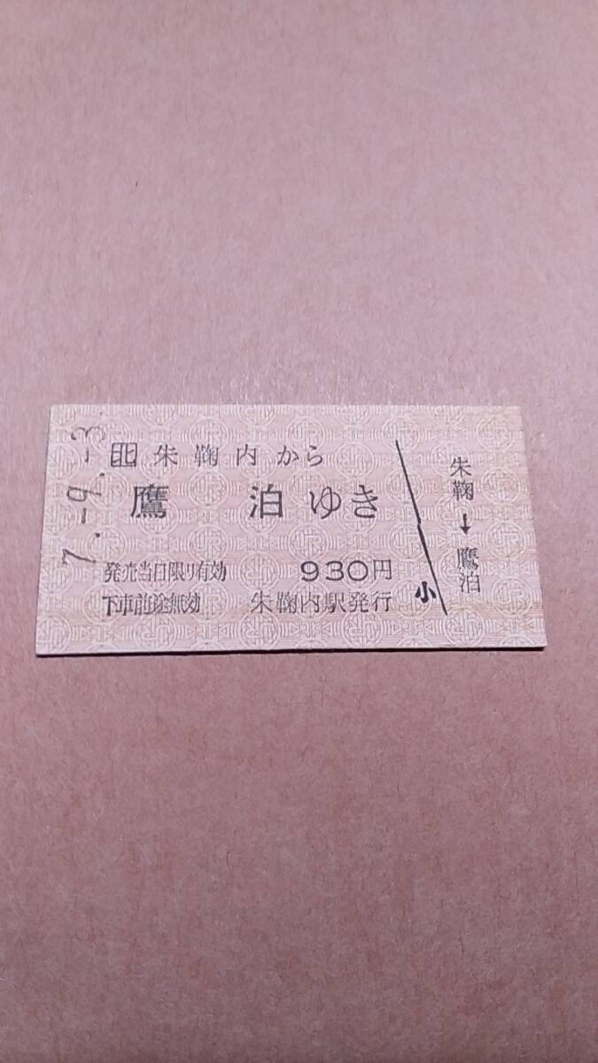 JR北海道 深名線 朱鞠内から鷹泊ゆき 930円 朱鞠内駅発行