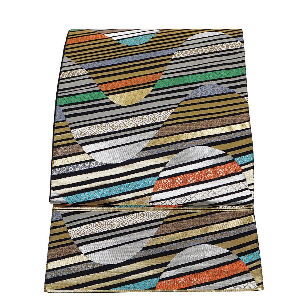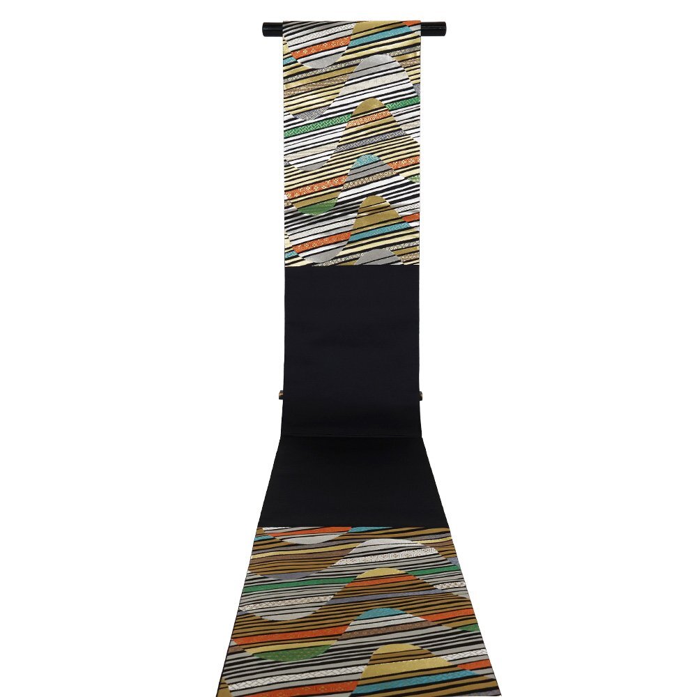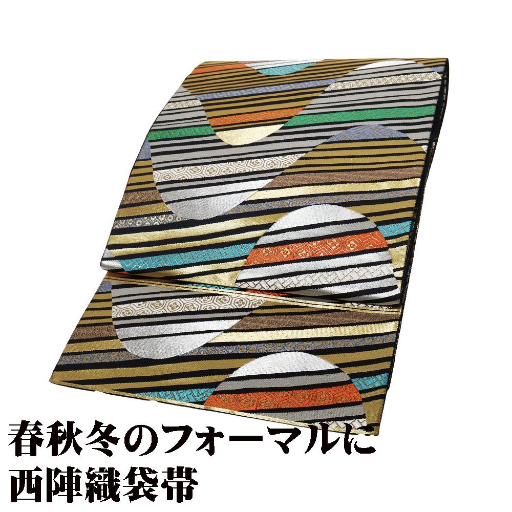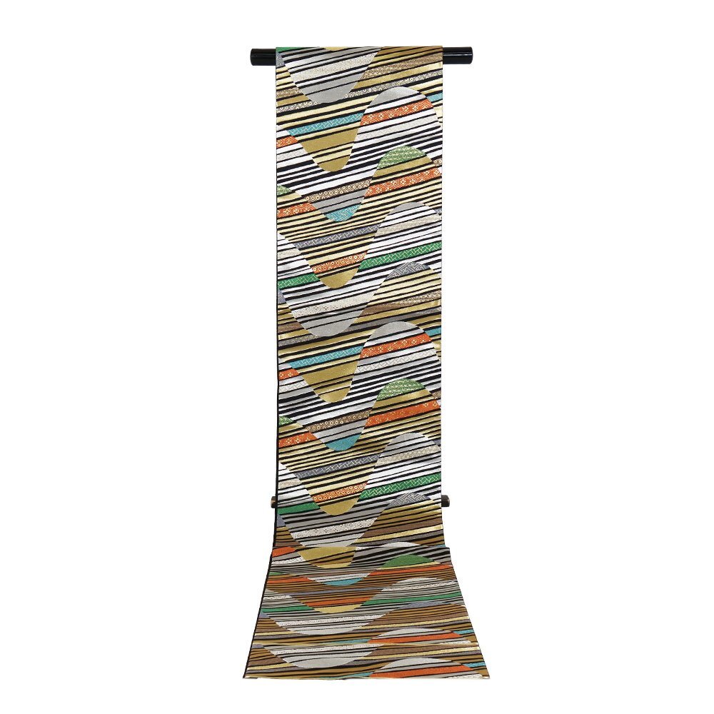 | 色・柄 | 西陣織袋帯 黒金地 吉祥文様・カラフル波 (写真では上手く色が出ない場合があります。ご了承下さい) ※お使いのディスプレイの種類や設定の差により 実物の色と画像の色が少々異なることもございます。 写真の枚数が多いので一度パソコンでご覧ください。 |