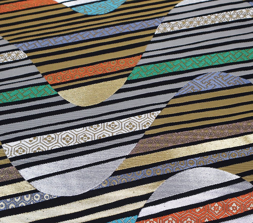 | 西陣織袋帯 黒紺地 吉祥文様・カラフル波 新品 仕立て上がり | |