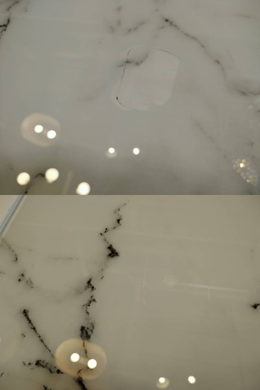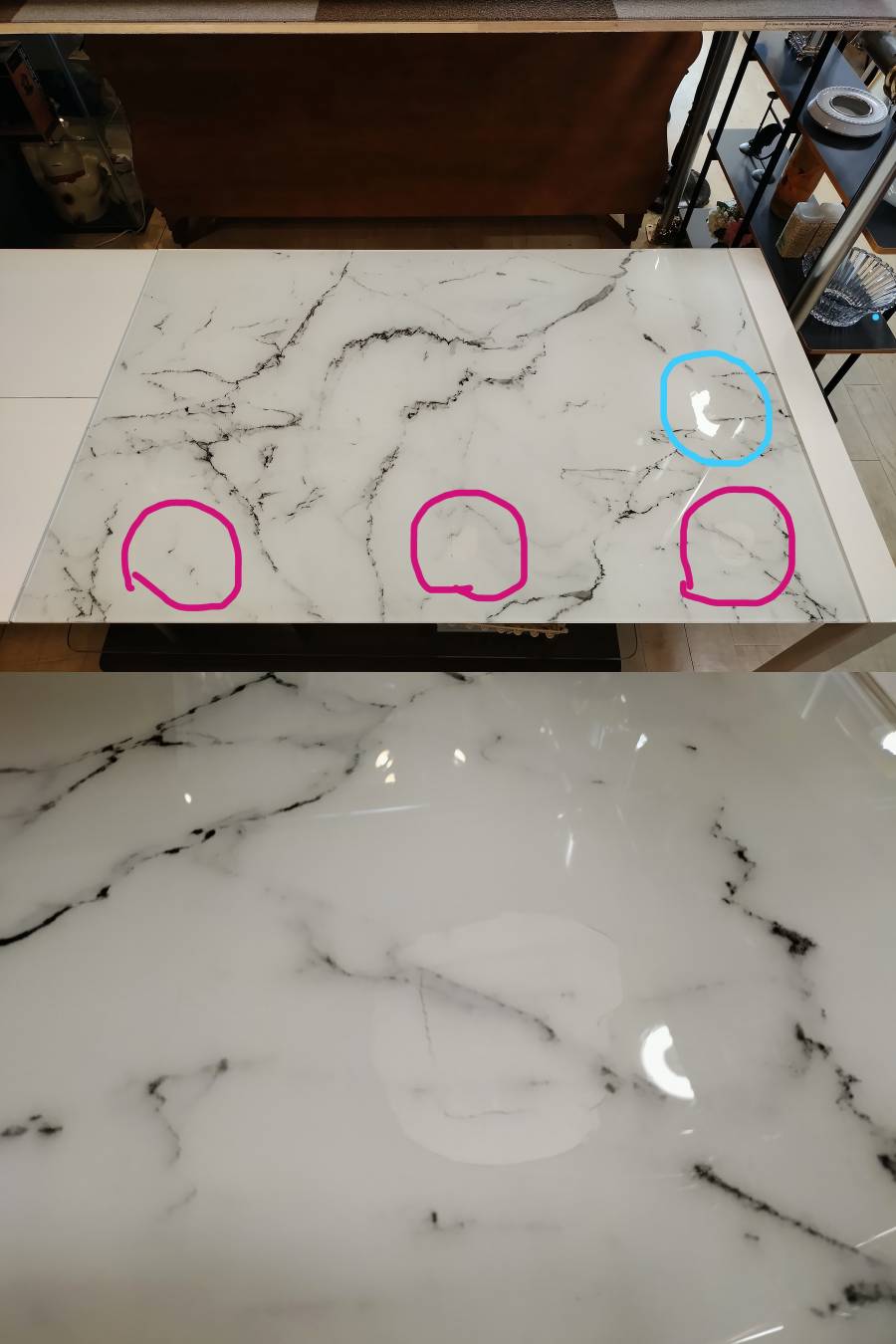 ↑ ●水色は照明の反射で、ピンクが傷部分● ↑