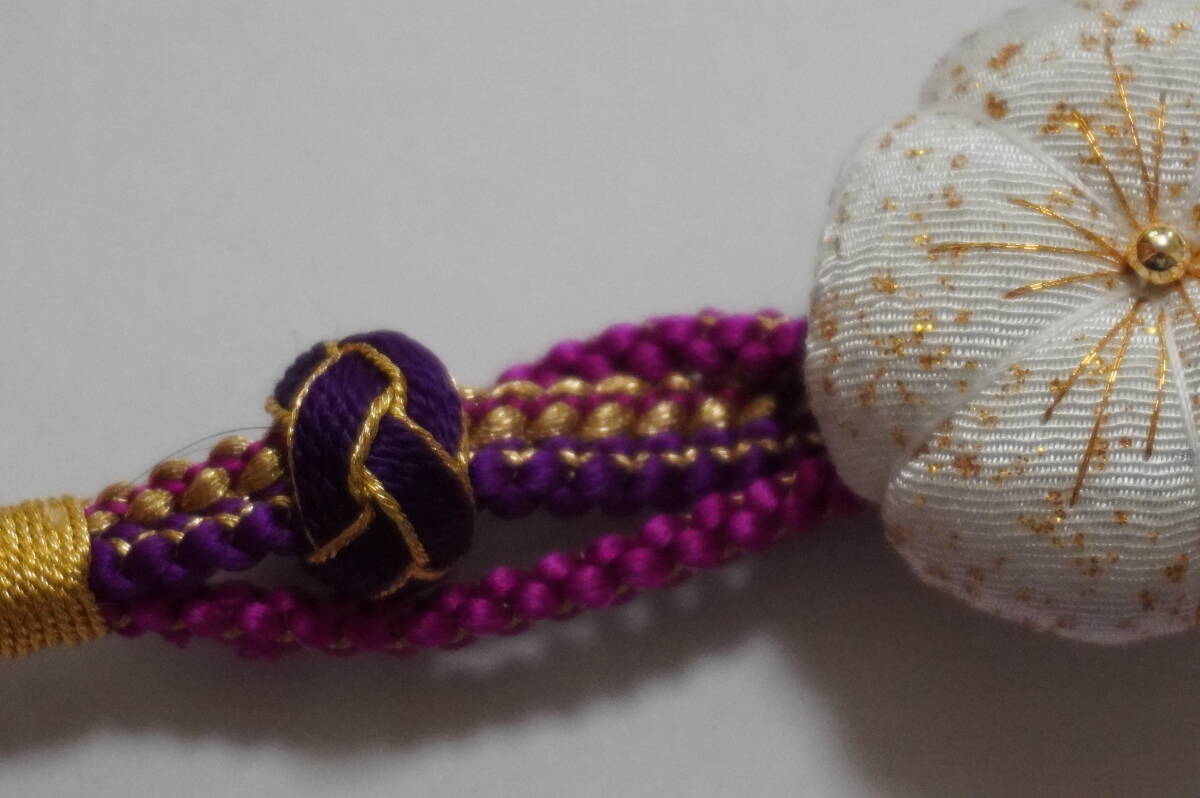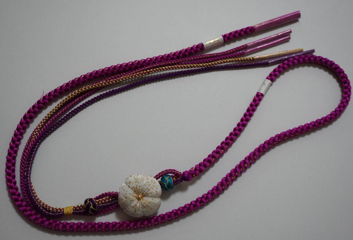 (特価)飾りつき丸帯締め 絹100%(含、金属糸使用) 飾りつき丸帯め。新品処分品。濃いピンク色 金色糸の編みこみアリ)で途中から4本分かれ、ちりめん地で45mmの花と、飾りつき(モニターにより、濃く、または薄くっている場合などありますので心配なかたは質問をしてください)。 巾約10mm 。長さ房を入れないで約155cm(M寸表示)