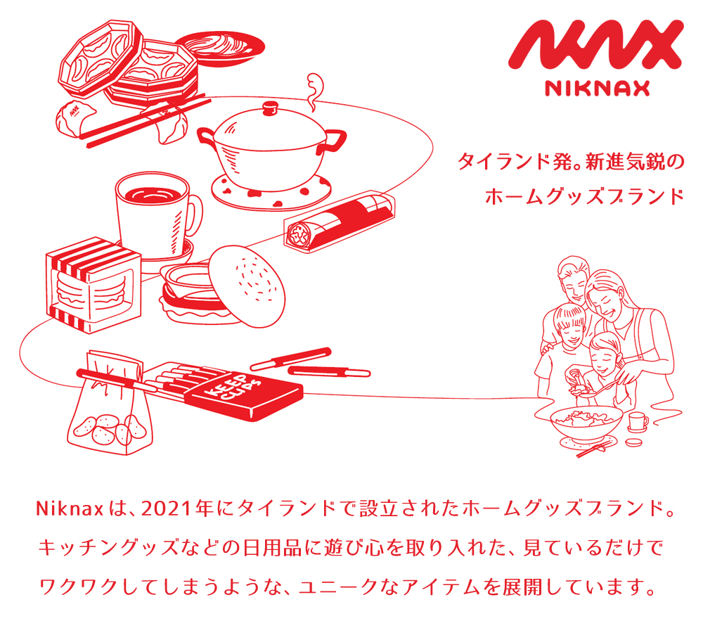 | ブランド | ![]() Niknax(ニックナックス) 2021年にタイランドで設立された新進気鋭のホームグッズブランド"Niknax" Niknaxはキッチングッズなどの日用品に遊び心を取り入れた、思わずワクワクしてしまうような、ユニークでクリエイティブなアイテムを展開しています。 |