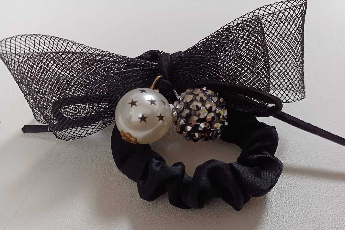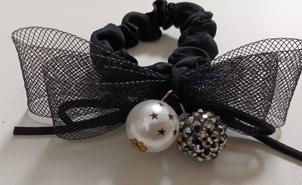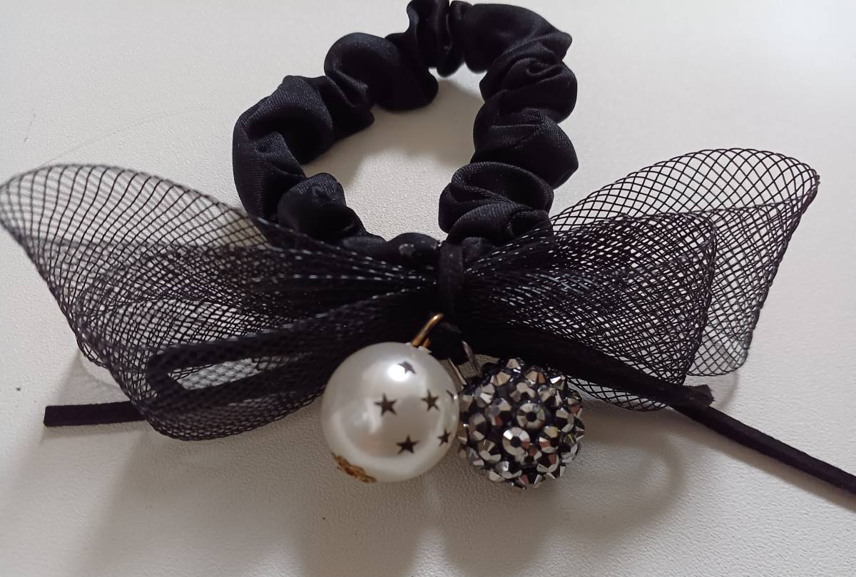 黒レースリボンとパール風とキラキラボールのアクセ付きヘアゴム髪ゴム