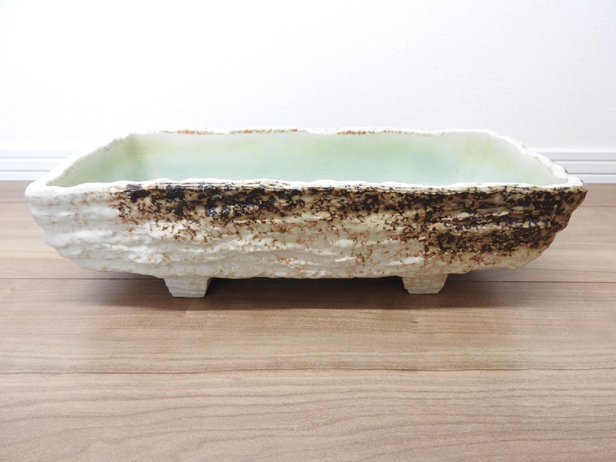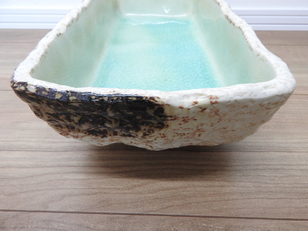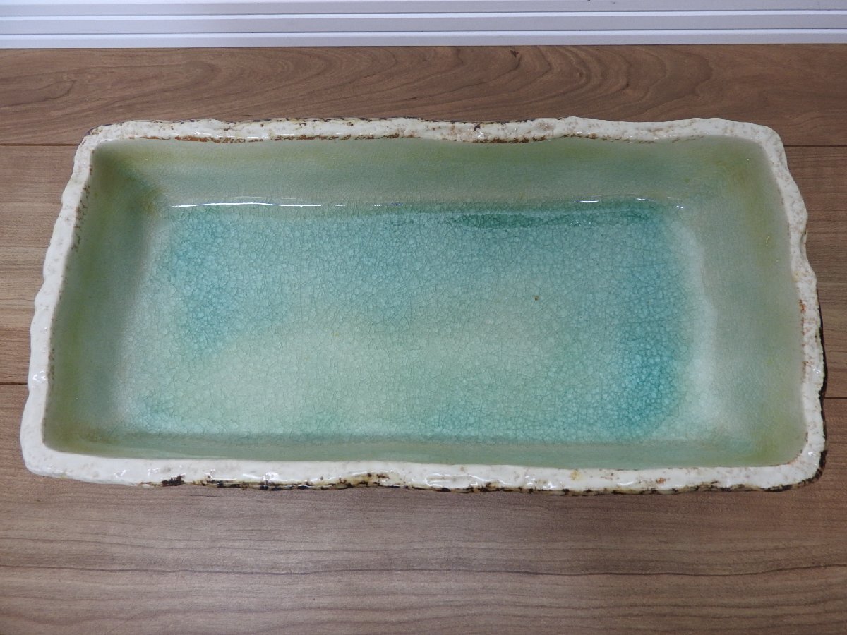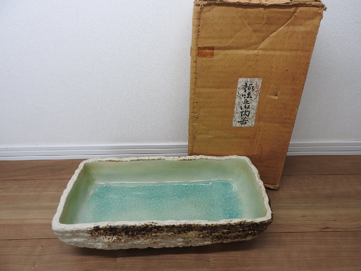 茶道具 煎茶道具 華道具 花入 花器 陶器 オブジェ グリーンになります。 特に傷等無く綺麗な状態かと思います。 外箱 保管による傷み汚れございます。 【サイズ】 幅 33㎝ 奥行 16.5㎝ 高さ 9㎝ 写っているものが全てです。 状態も含めて写真にてご確認下さい。 | ||||