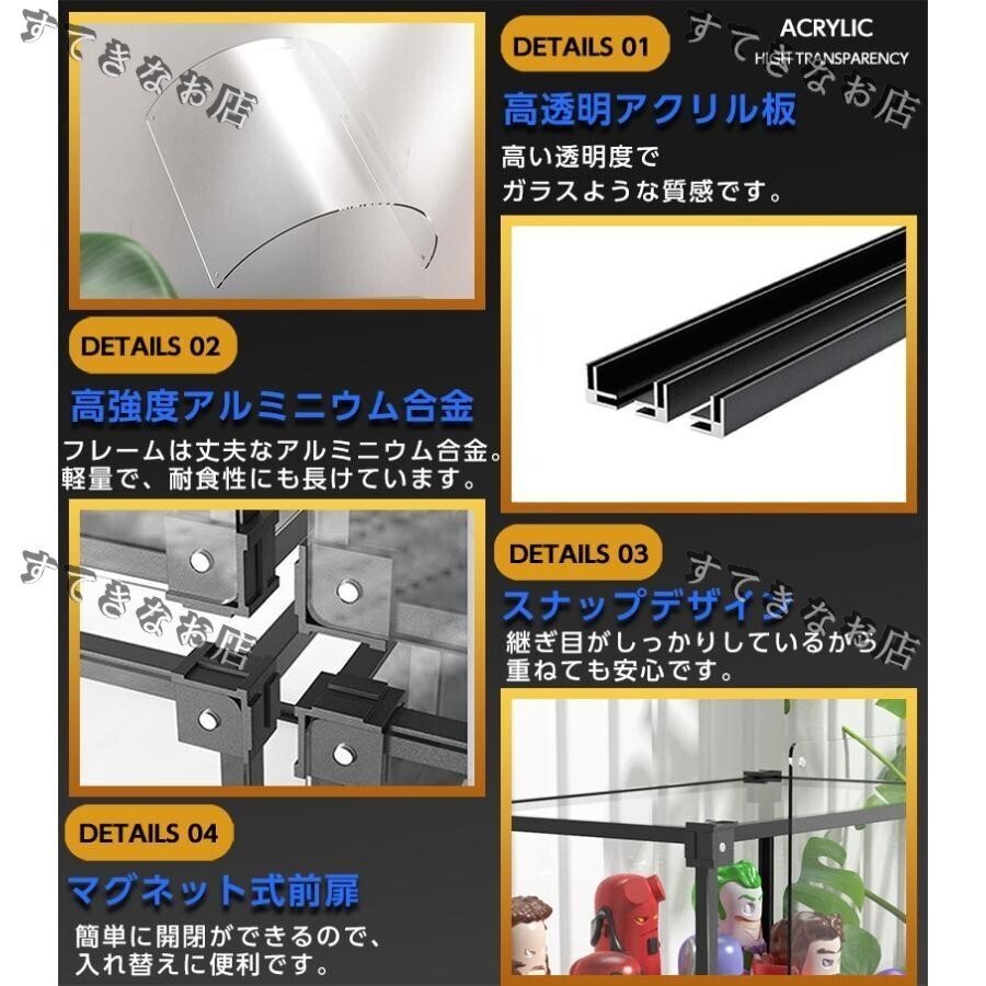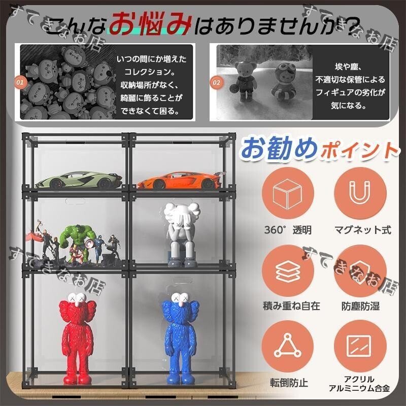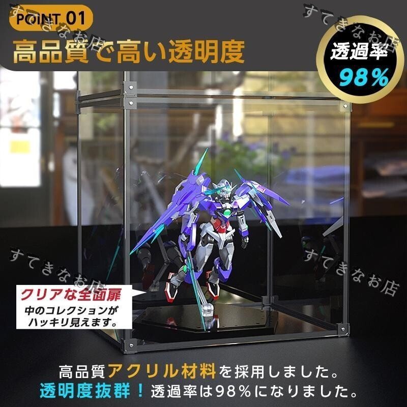 【透明度が高い】高品質アクリル材料を採用されて、透明度抜群、透過率は98%になりました。何も通さずに見るのと変わらないくらい透き通っています。お気に入るフィギュアの美しさを存分に展示されています。ガラスとマッチする透過率がありますが、ガラスよりも軽くて安全で、フィギュアをホコリから守るには最適だと思います。